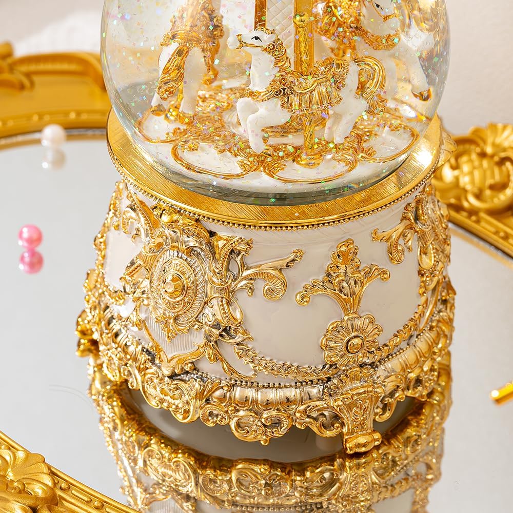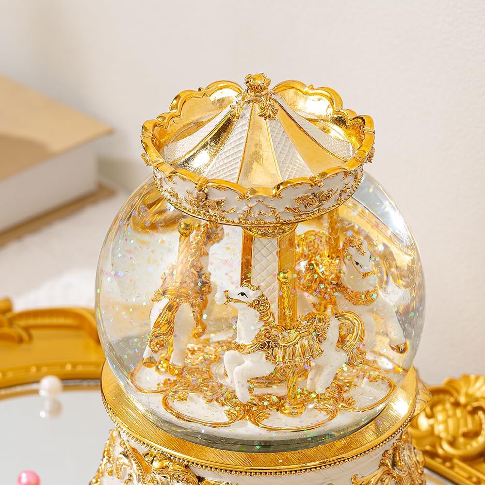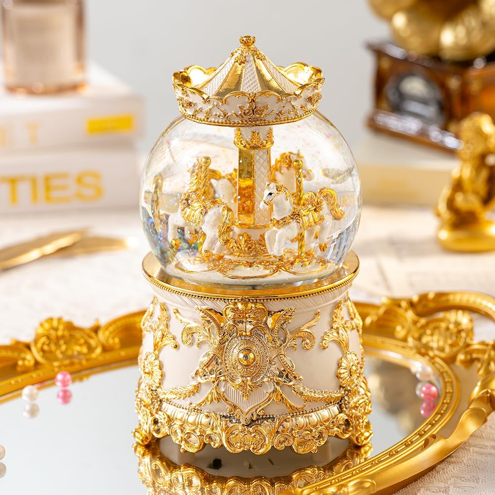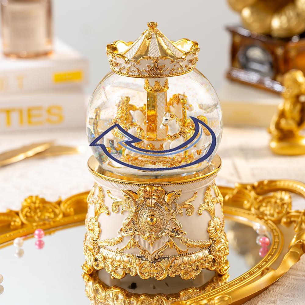 حرفية متقنة: قام الحرفيون الخبراء بتصميم كل عنصر في صندوق الموسيقى الدائري هذا بدقة. تم رسم الخيول بعرفها وذيولها المتدفقة بدقة، بينما تتميز المظلة والقاعدة المزخرفة بتفاصيل مطلية بالذهب. تعكس كل قطعة مزخرفة ومزخرفة الالتزام بالجودة والاهتمام بالتفاصيل، مما يجعلها قطعة فنية مذهلة.