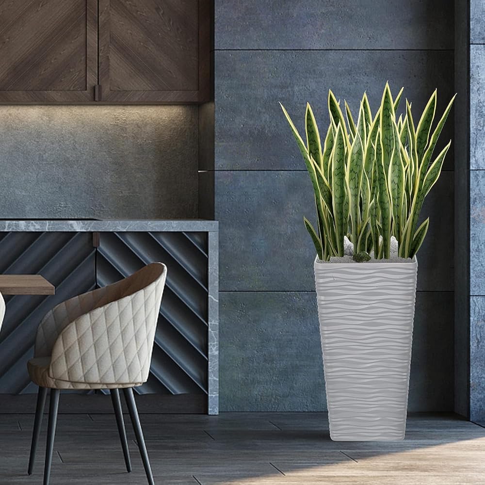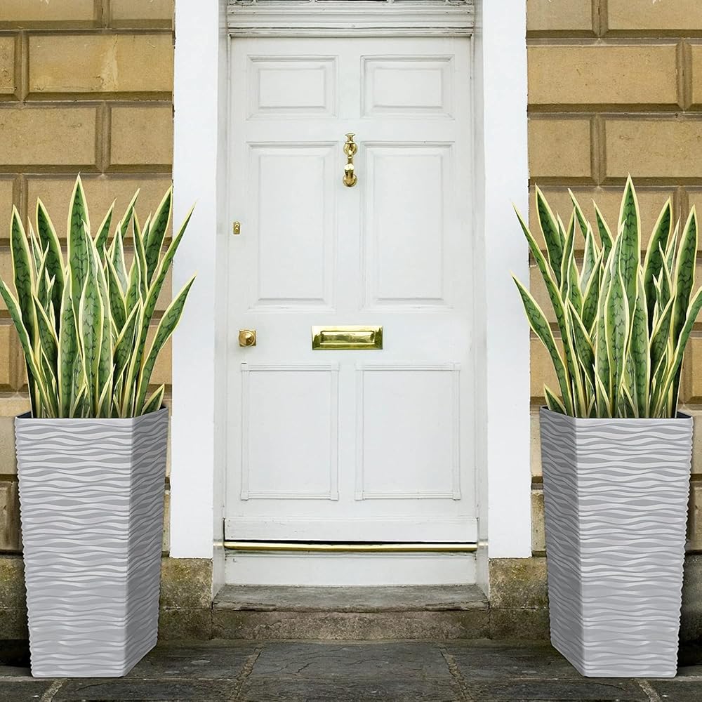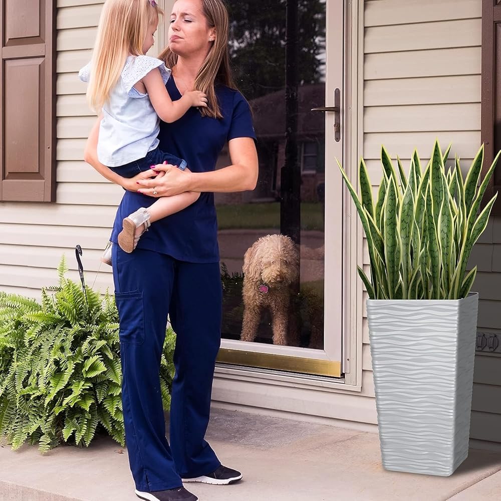 【About the planter】Our large square planters are designed with matte finishing exterior in soft, wavy shapes, with a ceramic visual display that adds fresh, decorative flair to your space. High-quality material for long-lasting use. Made with recyclable plastic and natural stone power, this large tall planter can withstand all harsh weather conditions as it comes with protection. Due to high-quality materials used to manufacture these planters, color will remain rich for many years.
