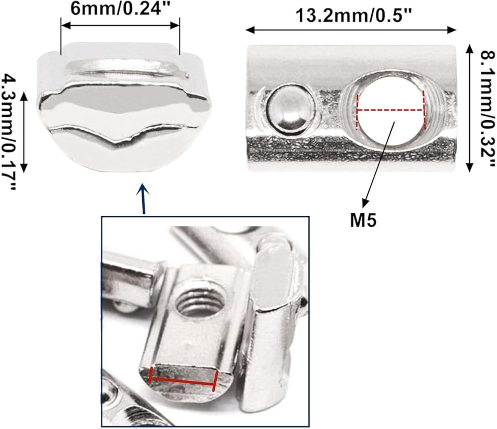 الحجم - يمكن إدخال صامولة M5 t مباشرة في فتحة فتحة الألومنيوم إلى أي نقطة تجميع لتوصيل أجزاء بثق الألومنيوم، وهو متوافق مع السكك الحديدية القياسية الأوروبية لسلسلة 2020 من الألومنيوم.