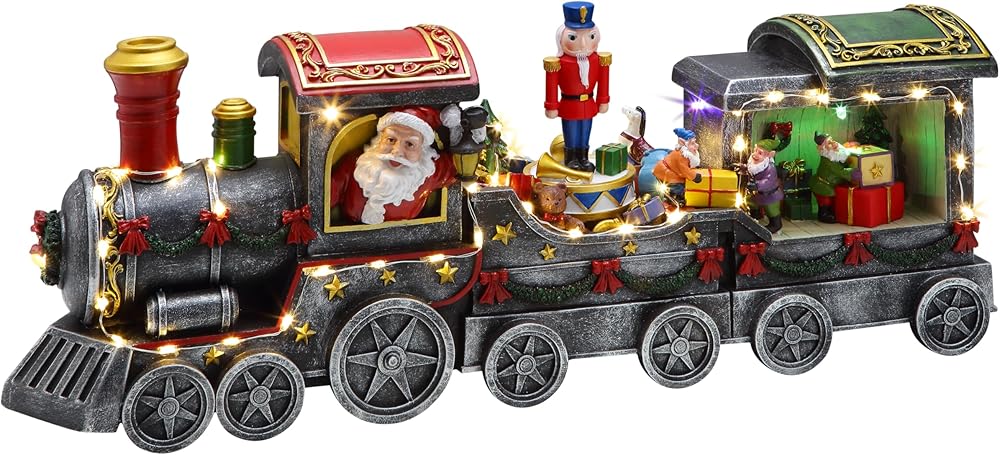 A train full of music, motion and fun! Santa's Express is loaded up with gifts, animated elves and reindeer. The reindeer look out from the caboose eagerly as the elves prepare the gifts. As a song begins to play, the wheels on the train begin to turn and move faster as the tempo picks up. The smokestack billows real smoke to delight the kid in all of us! Just a few drops of the included propylene glycol will bring the smokestack to life with billowing puffs of real "smoke." Plays 20 famous Christmas and railroading songs. Songs include "Wabash Cannonball", "I've Been Working on the Railroad", "We Wish You a Merry Christmas", "Jingle Bells", "Joy to the World", "Deck the Halls", "Casey Jones", "O Come All Ye Faithful", "12 Days of Christmas", "God Rest Ye Merry Gentlemen", "Hark! The Herald Angels Sing", "She'll Be Coming 'Round the Mountain When She Comes", "The First Noel", "O Christmas Tree", "Jolly Old St. Nicholas", "Good King Wenceslas", "Here We Come A-Caroling", "Up on the Housetop", "I Saw Three Ships", and "Good Christian Men, Rejoice". A spotlight shines from the head end and the sides of the train are adorned with garland and mini LED lights. Includes a 9vDC/800mA UL listed adaptor.
