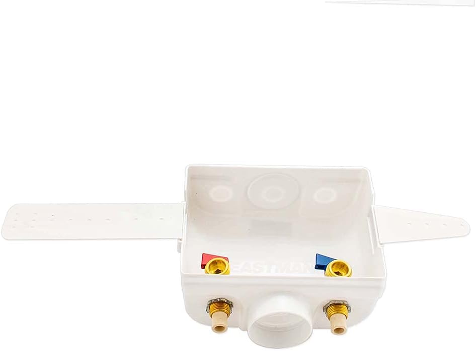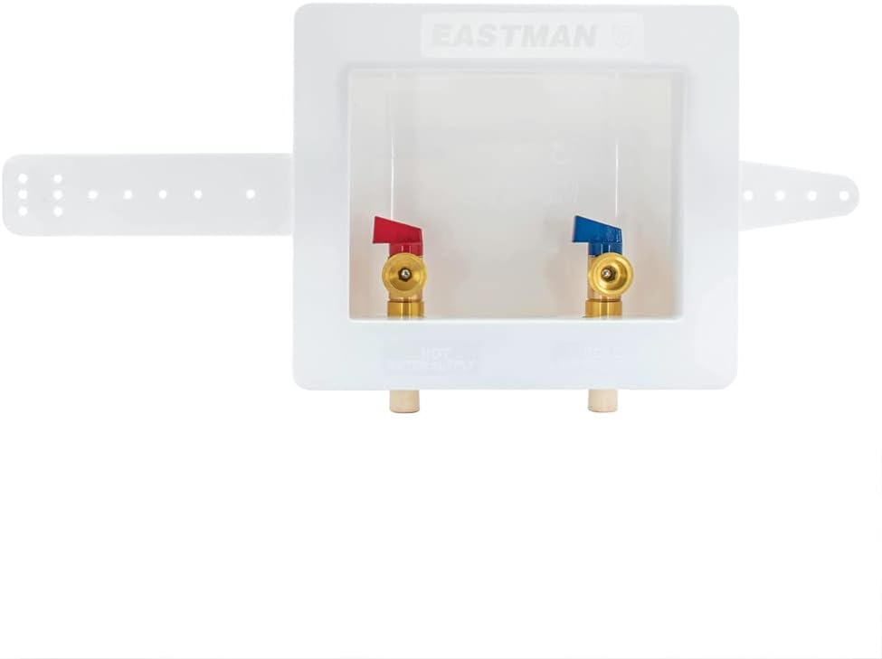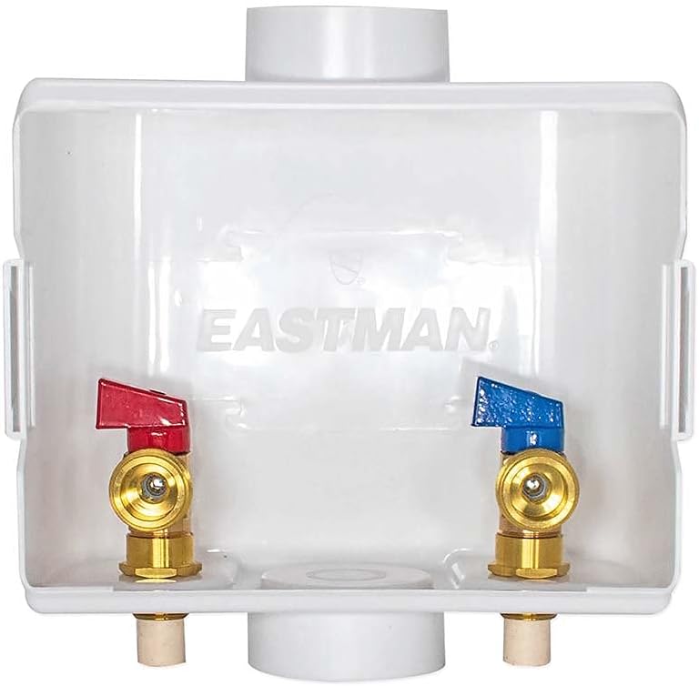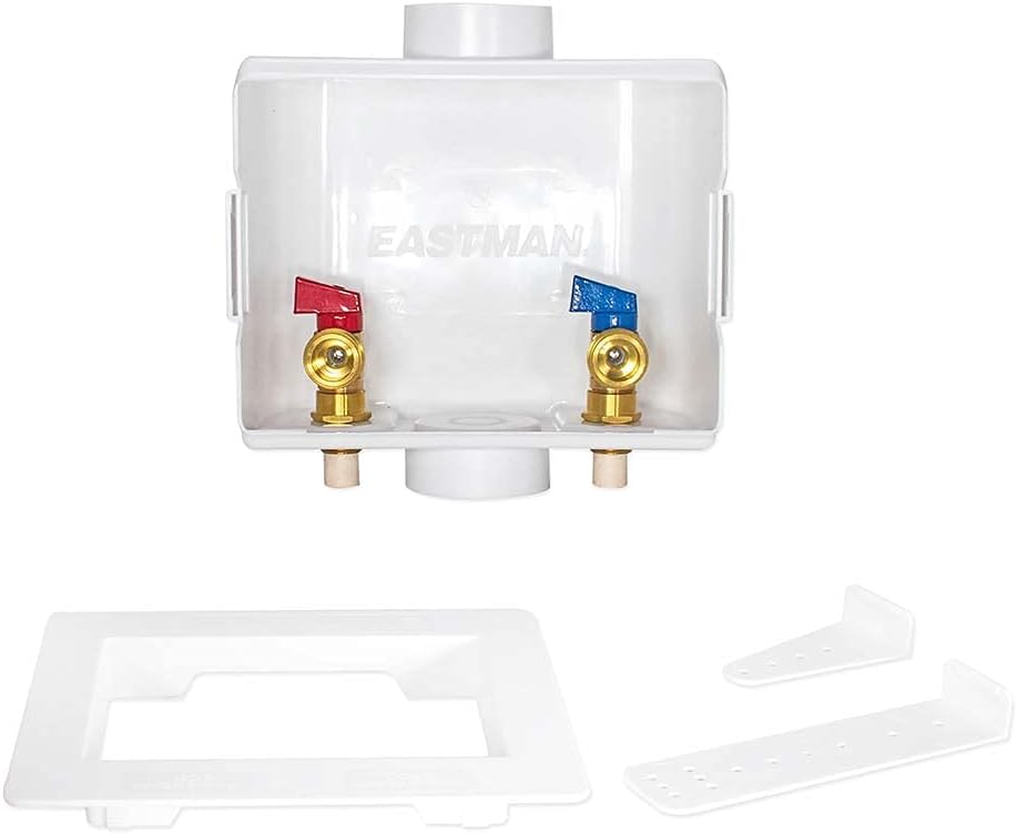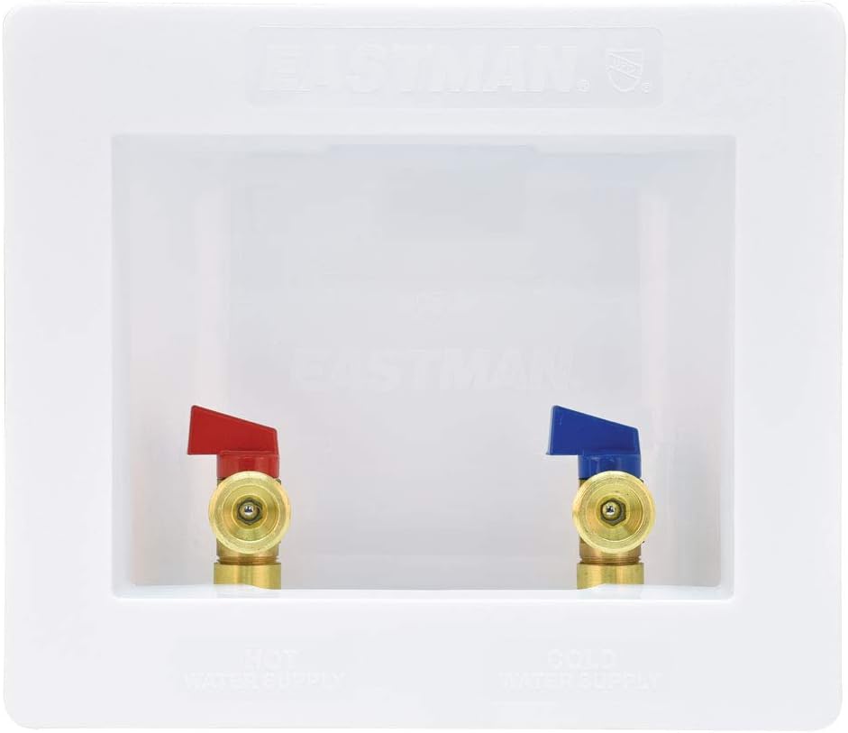WASHER MACHINE OUTLET BOX: Eastman washing machine outlet boxes provide a safe water supply installation for washing machines, preventing potential leaks with a raised drip guard and enabling easy access to the valves in case that shut off is required.