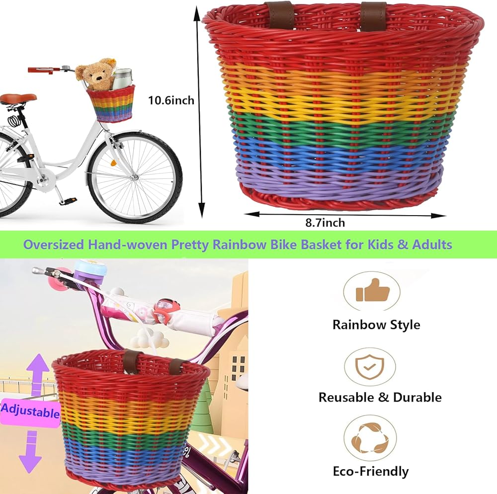 2. جميلة ولطيفة: سلة الدراجة الكبيرة متوافقة مع مجموعة أكبر من الدراجات، مثل: سكوتر، دراجة كروزر، دراجة التوازن. تصميم قوس قزح وكبير، سلة دراجة منسوجة يدويًا للأولاد والبنات. أضف لمسة من الألوان إلى دراجة طفلك مع سلة الدراجة الجميلة. تعزيز المظهر الجمالي الشامل للدراجة. استمتع بالقيادة بأناقة واجذب الأنظار