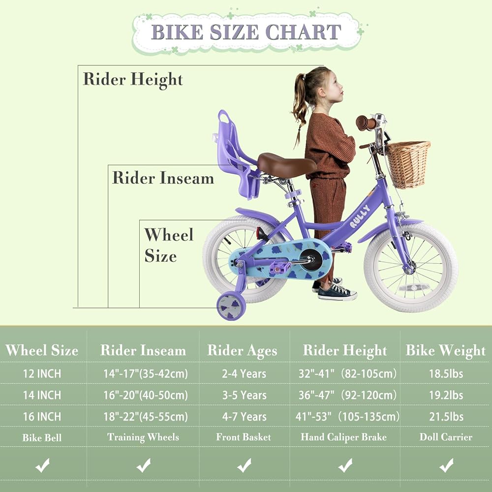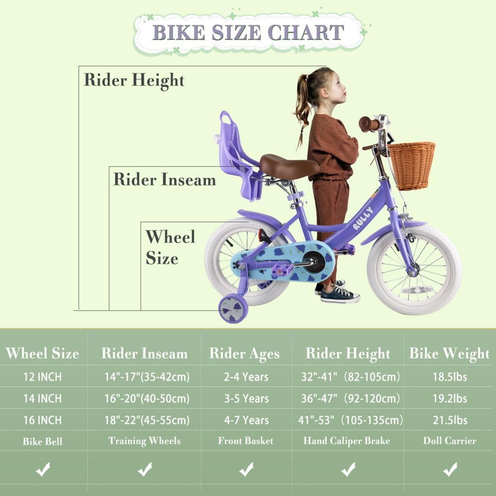 المزيد من خيارات الحجم! دراجة مقاس 12 بوصة مناسبة للفتيات بعمر 2-4 سنوات (33-41 بوصة)؛ دراجة مقاس 14 بوصة مناسبة للفتيات من عمر 3-5 سنوات (35 - 47 بوصة)؛ الدراجة مقاس 16 بوصة مناسبة للفتيات من سن 4 إلى 7 سنوات (41 إلى 53 بوصة). استخدم جدول المقاسات سهل المتابعة الخاص بنا، وستجد المقاس المثالي لطفلك الصغير. ملحوظة: يرجى أخذ ارتفاع الأطفال بعين الاعتبار.
