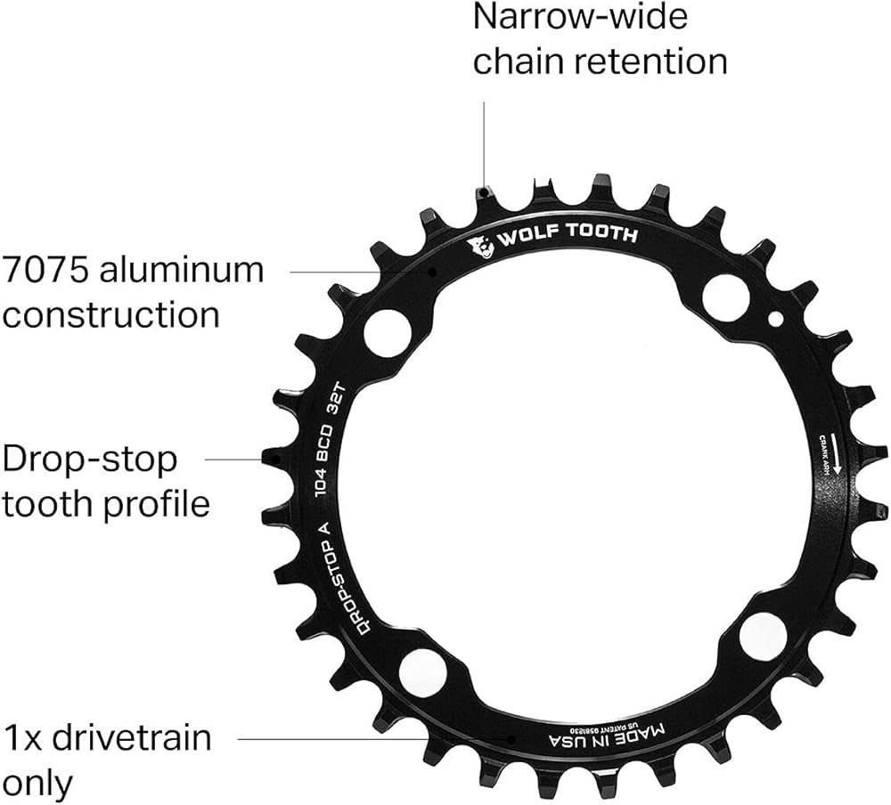Wolf Tooth's patent-pending Drop-Stop wide/narrow tooth profile for the ultimate chain retention and mud shedding ability