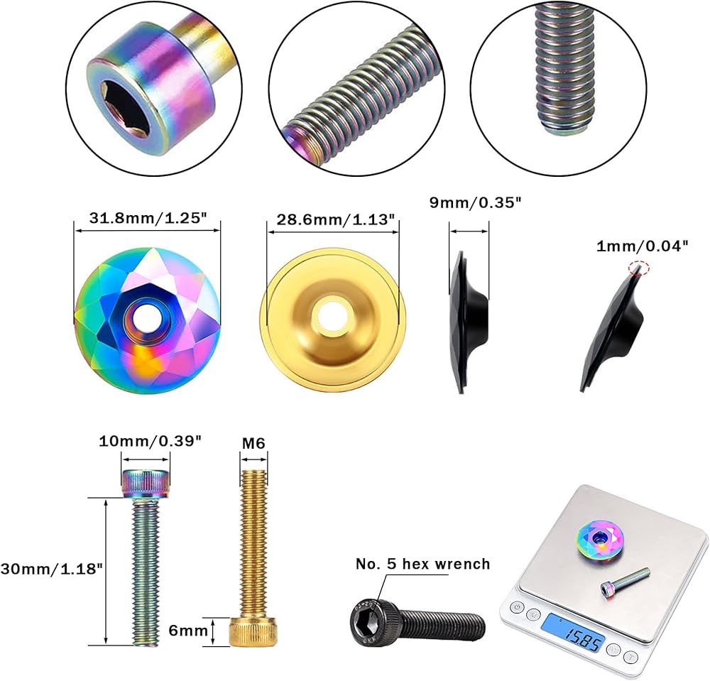 WHAT YOU WILL GET - 1 x Al alloy headset top cap+1pcs M6 x 30mm stainless steels bolts (Thread Diameter: 6mm/0.24"; Thread Length: 30mm/1.18"); 1pcs box (L x W x H: 9.1 x 6.3 x 1.8cm); Weight About 15.85g/0.56oz/Piece; 49.26g/1.74oz/Box,Total Length: 36mm; Head Size: 10 x 6mm/ 0.39" x 0.24" (D x H);