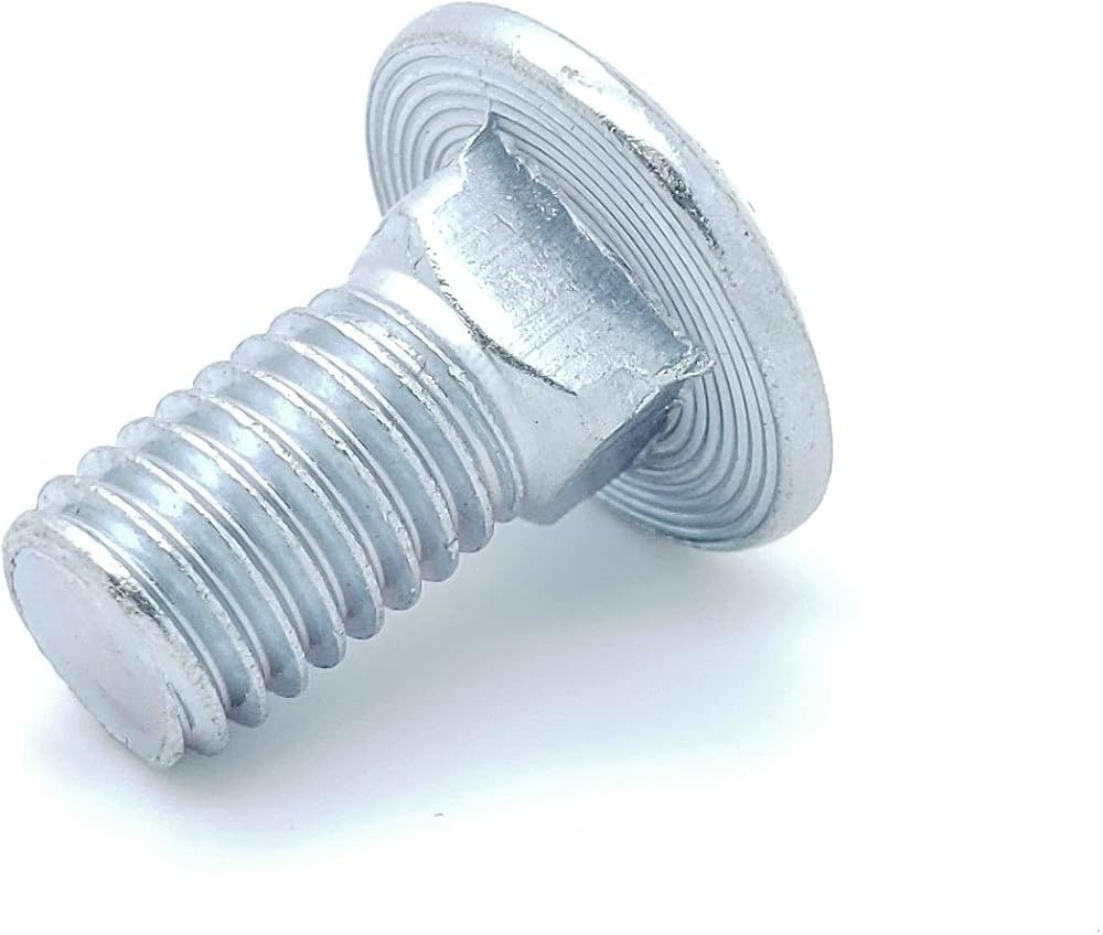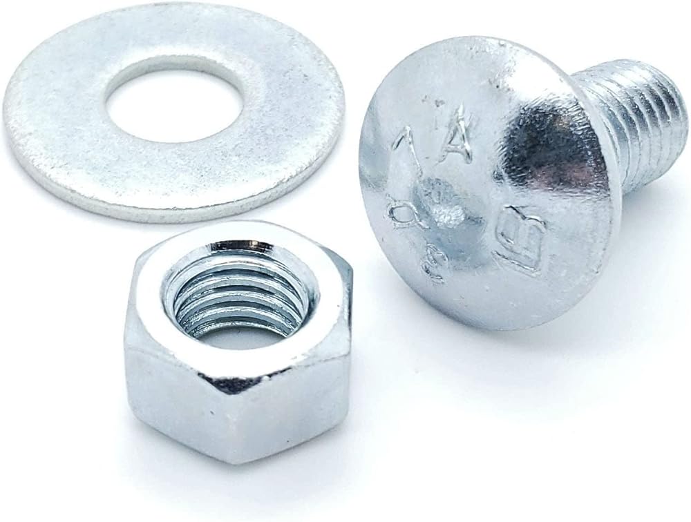 Round domed head with square neckPackage includes ten each of bolts, hex nuts & washersZinc plated for corrosion resistanceSuitable for indoor or outdoor useBCP Fasteners are always backed by a 100% satisfaction guaranteeA carriage bolt, coach bolt or round head square neck bolt is a form of bolt used to fasten metal to wood or wood to wood.Carriage bolts are distinguished from other bolts by its shallow mushroom head and the portion immediately beneath the head is formed into a square section. This makes the bolt self-locking when placed through a square hole in a metal strap, or a round hole in most wood. This allows the fastener to be installed with only a single tool, a spanner or wrench, working from one side. The head of a carriage bolt is usually a shallow dome. The squared section is of the same size as the diameter of the bolt shank, with a plain unthreaded shank.Carriage bolts were developed for use through iron strengthening plates on either side of a wooden beam. It is commonplace though to use them to bare timber, the squared section giving enough grip to prevent rotation.Carriage bolts are extensively used in security fixings, such as the Brenton Bolt where the bolt must only be removable from one side. The smooth domed head and square nut below prevent the carriage bolt from being unlocked from the insecure side.