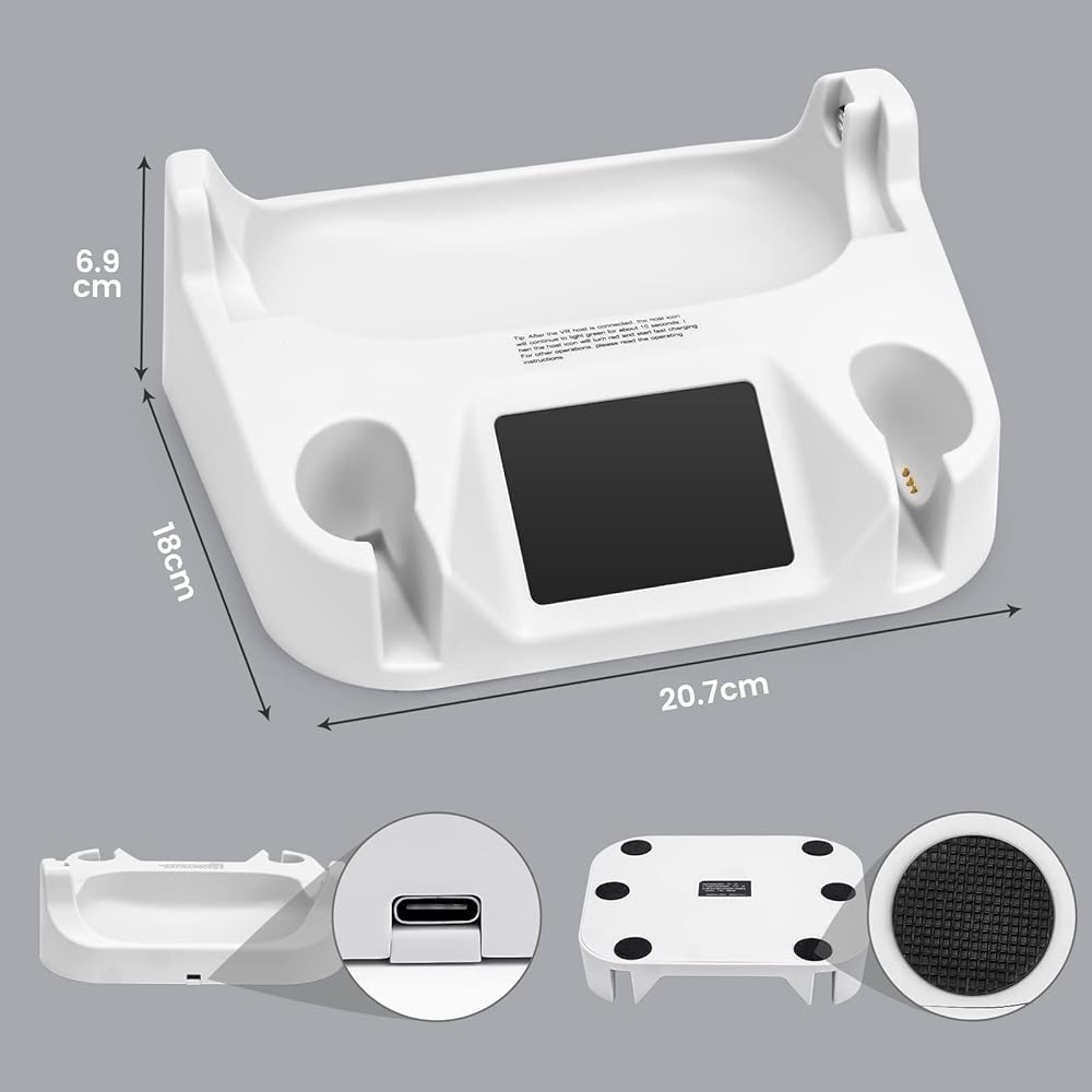 【تصميم مغناطيسي قوي وشحن ثابت】يضمن الاتصال المغناطيسي القوي المدمج محاذاة ثابتة وسريعة مع منفذ الشحن. تزن قاعدة شحن الواقع الافتراضي 860 غرام، مما يوفر الثبات والمتانة لمنع إمالة أو انزلاق سماعة الواقع الافتراضي. بالإضافة إلى ذلك، يتميز المنتج بوسادات مضادة للانزلاق في الأسفل من أجل وضع آمن.