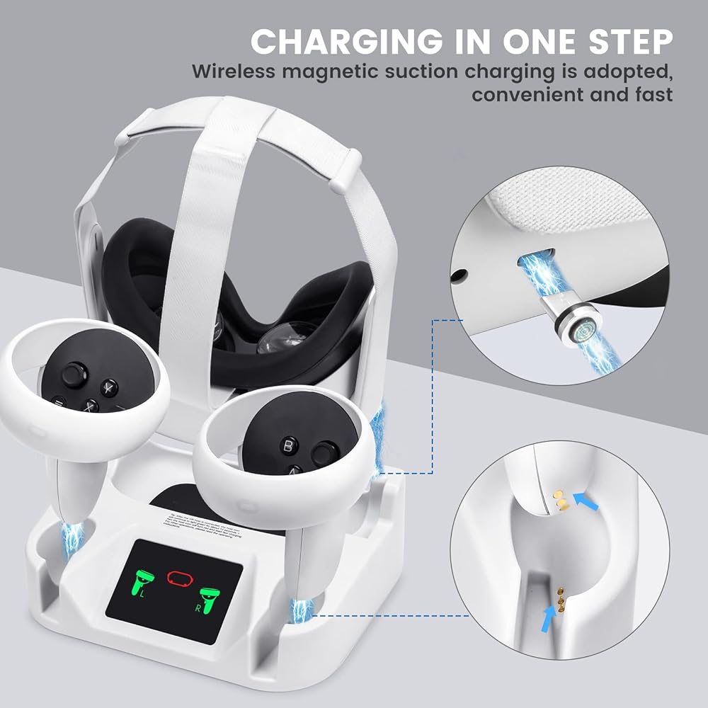【شحن سريع】يمكن لحامل الشحن لميتا كويست 2 شحن سماعة الرأس بالكامل في حوالي 3-4 ساعات وأجهزة التحكم في حوالي 4-5 ساعات. أثناء الشحن، يكون ضوء مؤشر LED أحمر ويتحول إلى اللون الأخضر عند شحنه بالكامل. عند شحن وحدات التحكم وسماعة الرأس وحزام ايليت في وقت واحد، قد يتم تمديد وقت الشحن.