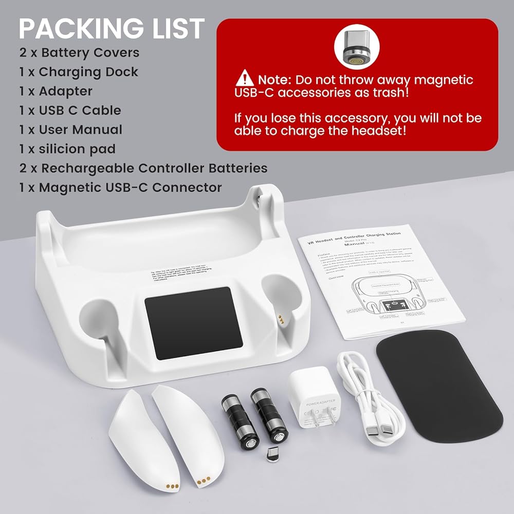 【ما تحصل عليه】تتضمن العبوة 1 × قاعدة شحن، 1 × محول، 1 × كابل USB C، 1 × موصل USB C مغناطيسي، 2 × بطارية تحكم قابلة لإعادة الشحن، 2 × غطاء بطارية، 1 × دليل المستخدم، 1 × وسادة سيليكون. ضمان لمدة 12 شهرًا. إذا كانت لديك أي أسئلة حول منتجاتنا وخدماتنا، فلا تتردد في الاتصال بنا. سنقدم لك إجابات مرضية على الفور!