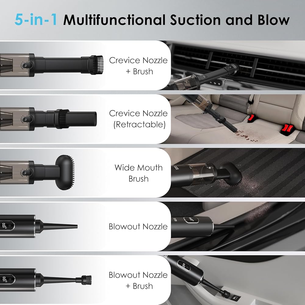 متعددة الوظائف 5 في 1: تأتي مكنسة السيارة الخاصة بنا مجهزة بملحقات قابلة للدمج متعددة الوظائف 5 في 1، تجمع بين وظائف المكنسة الكهربائية والنفخ والنفخ. تقوم فوهة الشقوق التلسكوبية وفوهة الشفط الواسعة بتنظيف المناطق التي يصعب الوصول إليها في سيارتك بكفاءة، مثل فتحات كوب الماء، وفتحات البطاقات، ووسائد المقاعد، وسجاد الأرضية. يمكن استخدام فوهة النفخ لمختلف الأنشطة الخارجية. يمكن لفوهة النفخ بالفرشاة أن تزيل الغبار من لوحات المفاتيح وعدسات الكاميرا وآلات القهوة