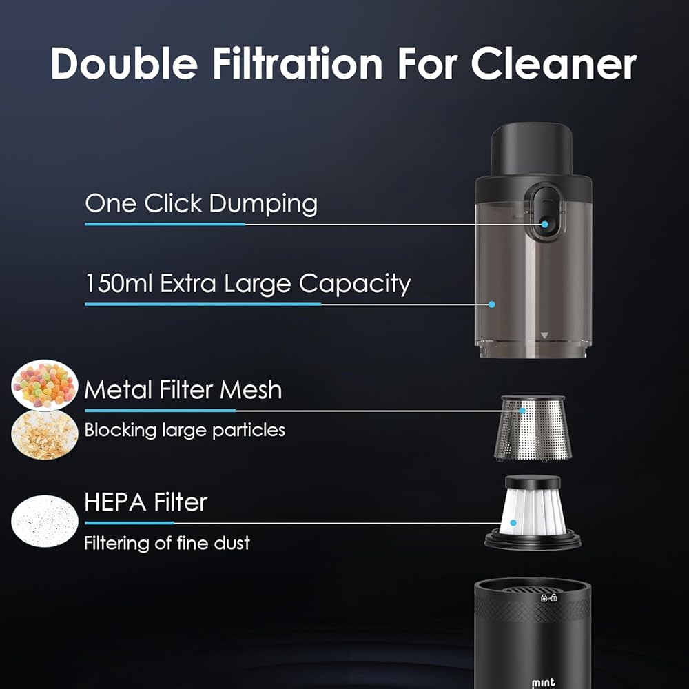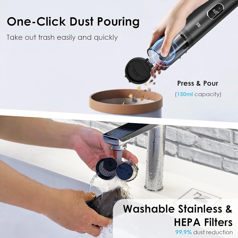 تصميم خفيف الوزن ولاسلكي: الجسم الرئيسي لهذه المكنسة الكهربائية الصغيرة مصنوع من سبائك الألومنيوم الممتازة ويزن 1.1 رطل فقط، وهو متين وخفيف الوزن. بفضل التصميم اللاسلكي وميزة التفريغ بلمسة واحدة، فإن مكنسة السيارة المحمولة اللاسلكية تجعل من السهل البقاء نظيفًا وإفراغ سلة المهملات. كما أن كوب الغبار اللاسلكي المحمول بسعة 150 مل يمكن تفريغه وتنظيفه بسهولة، كما يمكن غسل وإعادة استخدام فلاتر الستانلس ستيل ومرشحات HEPA.