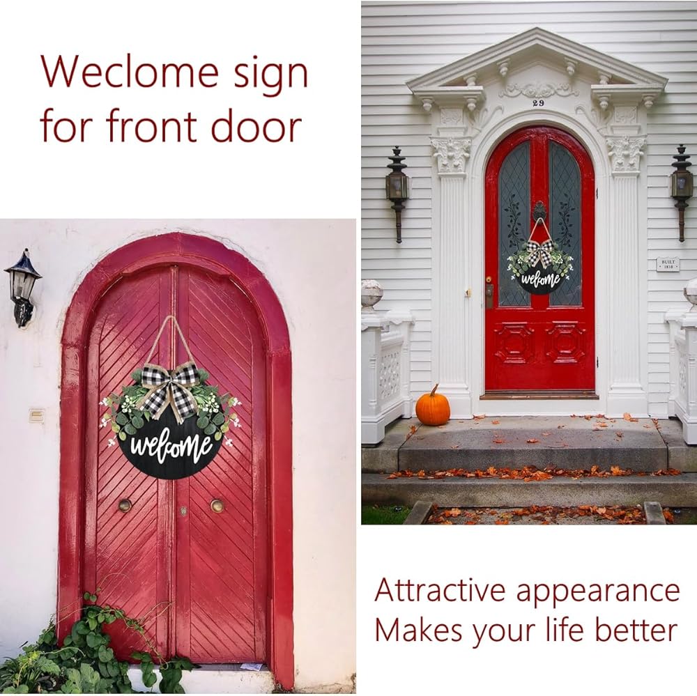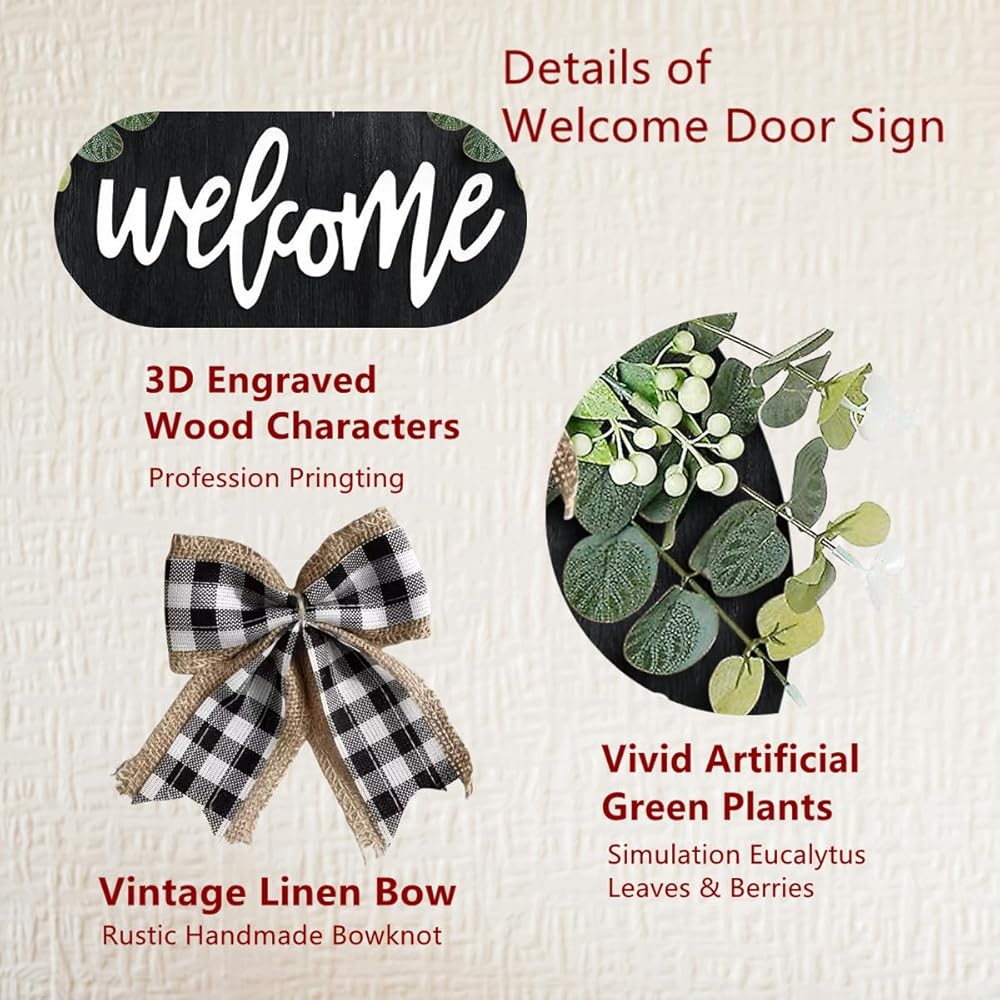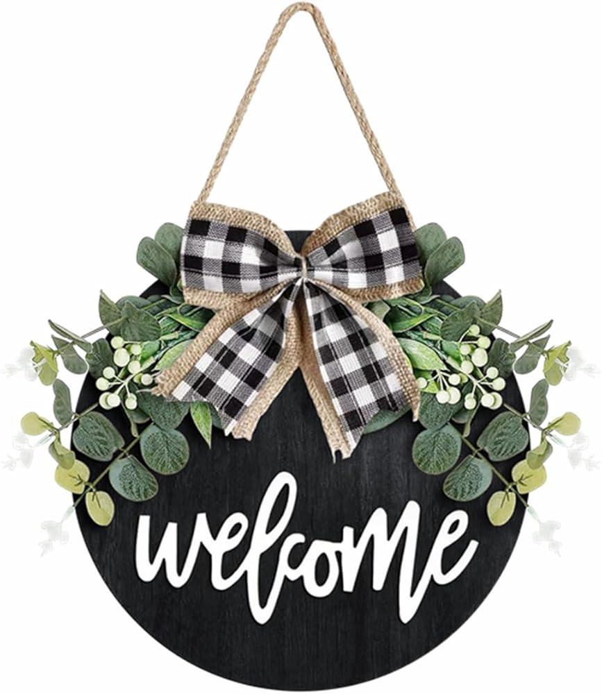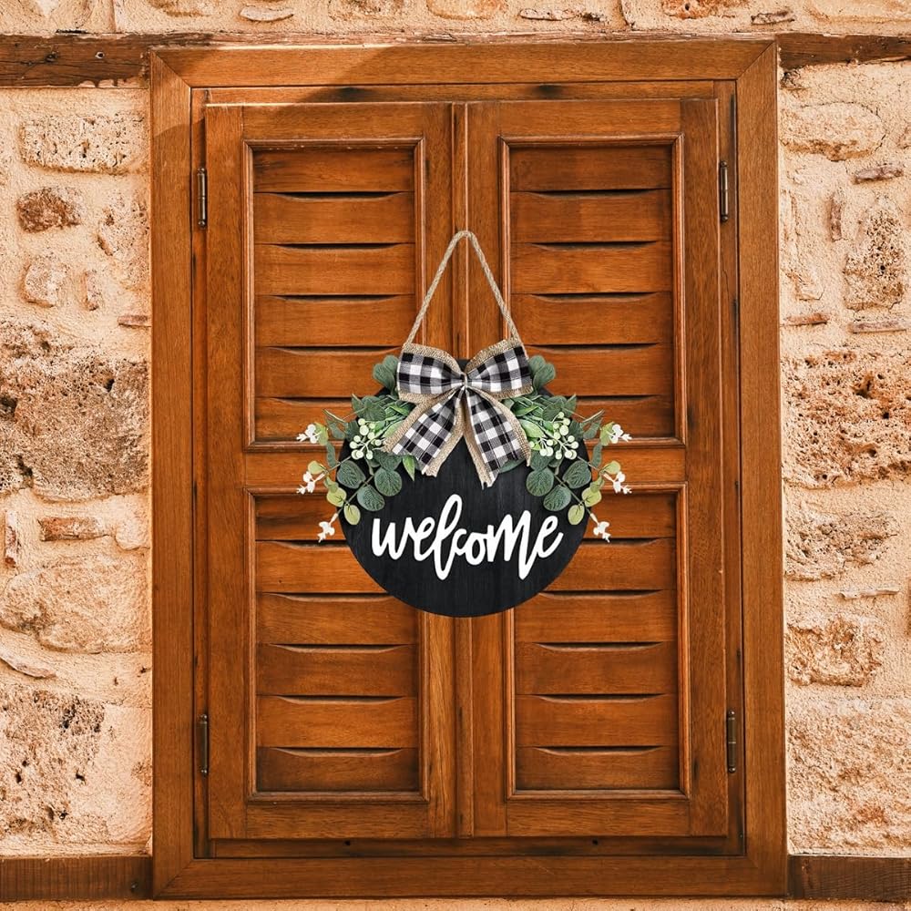 علامة ترحيب لديكور الباب الأمامي، إكليل ديكور جداري لمنزل المزرعة مع إكليل الأوكالبتوس وقوس الجاموس، علامة ترحيب إكليل موسمي ريفي خشبي، علامة ديكور المنزل