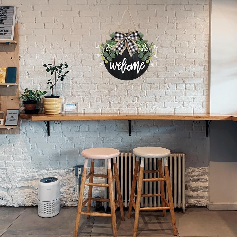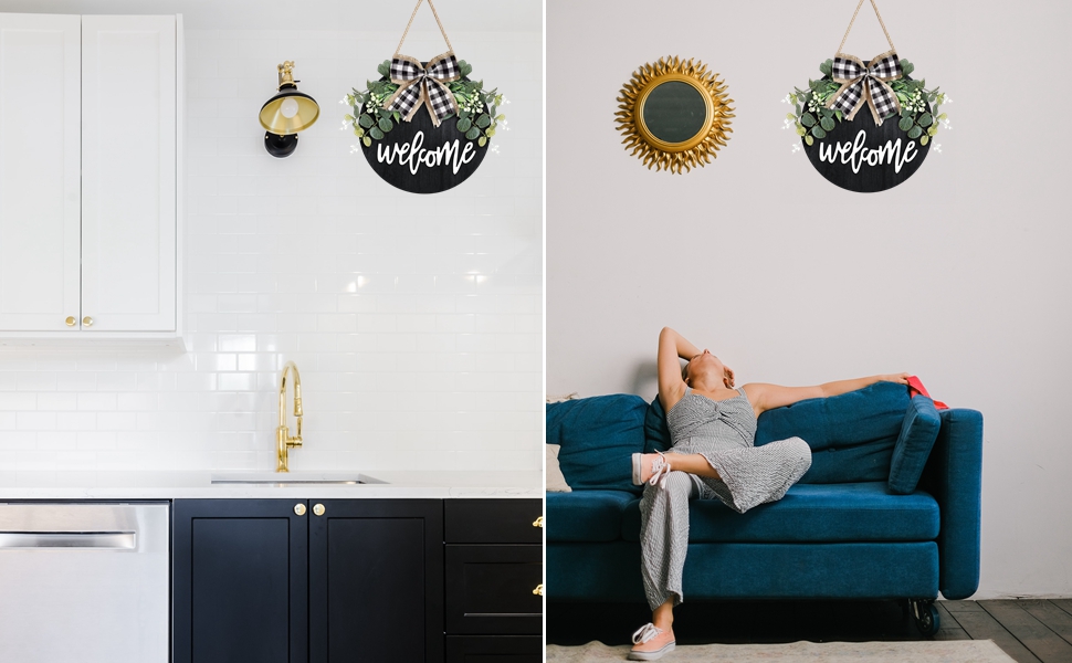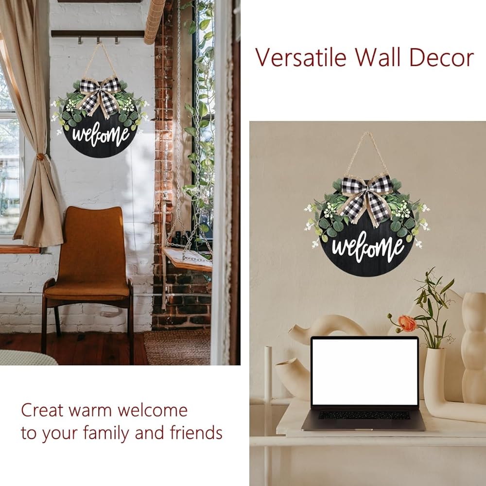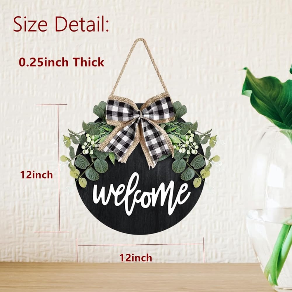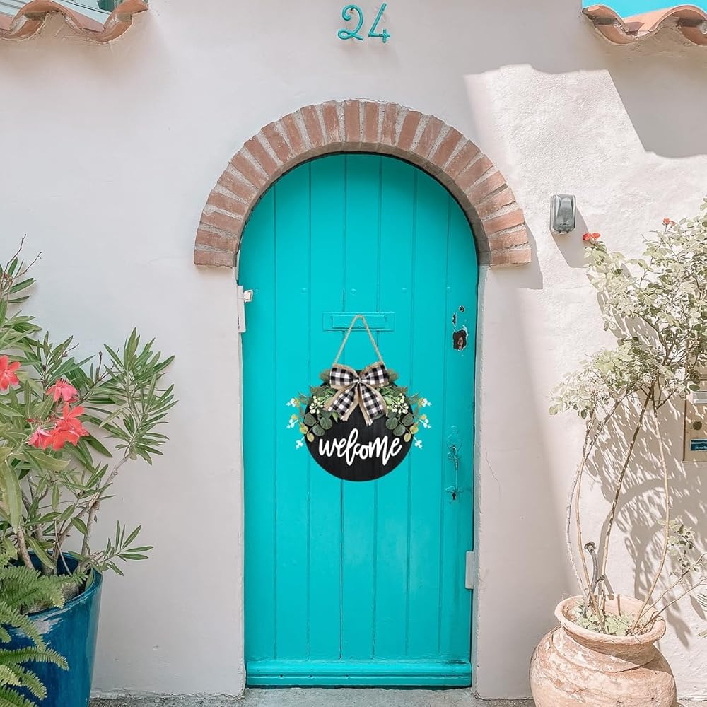 علامة ترحيب لديكور الباب الأمامي، إكليل ديكور جداري لمنزل المزرعة مع إكليل الأوكالبتوس وقوس الجاموس، علامة ترحيب إكليل موسمي ريفي خشبي، علامة ديكور المنزل