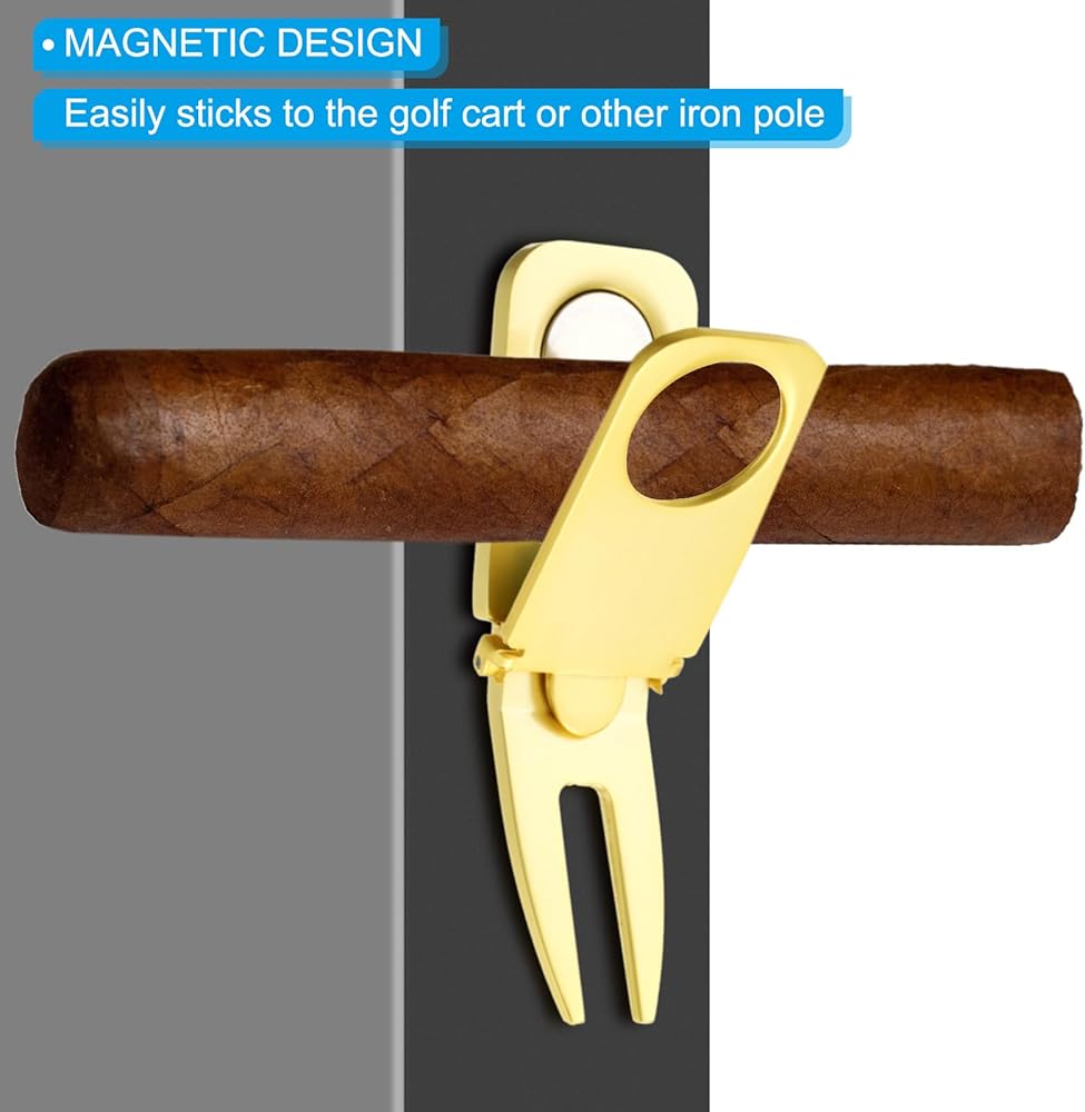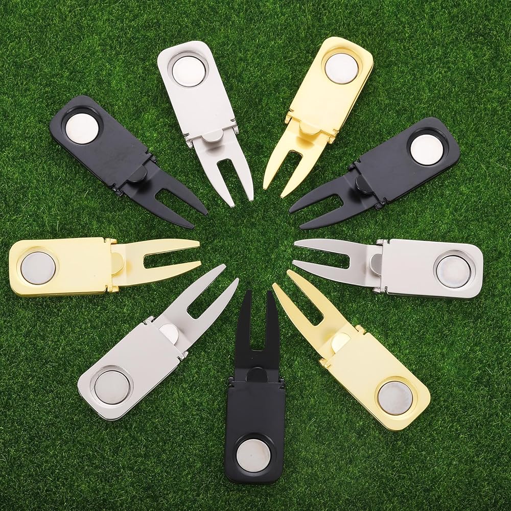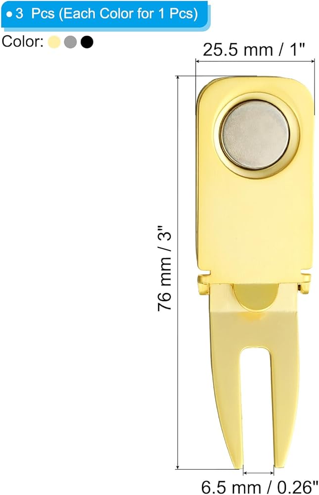 Golf pitch fork is designed with a fork at the front end, enabling easy insertion into the lawn to create a ball mark. The magnetic design makes the holder easier to fix the item on the golf cart without worrying about the items slipping off.
