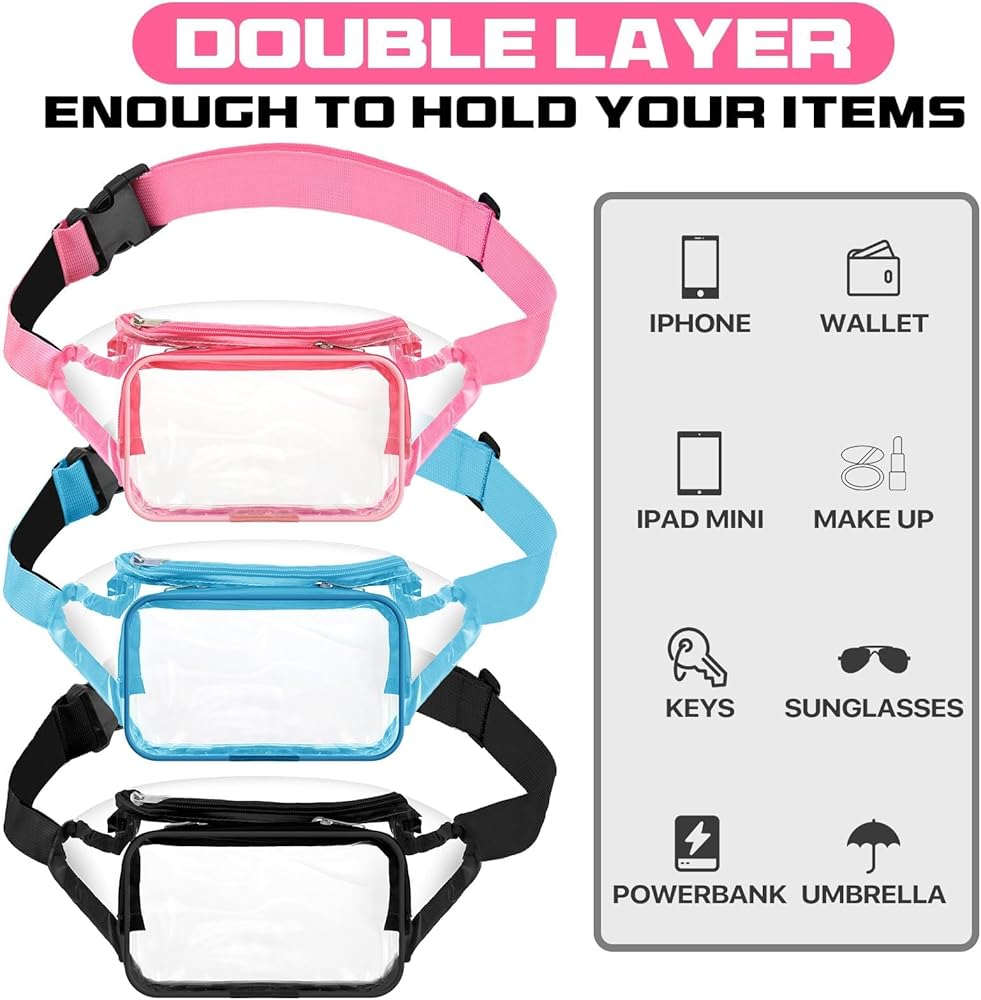 Despite its small and sleek size, the clear belt bag offers a large capacity, it is designed to ample space, ensuring your essentials like phones, wallets, keys, and cards fit comfortably and are easily accessible.