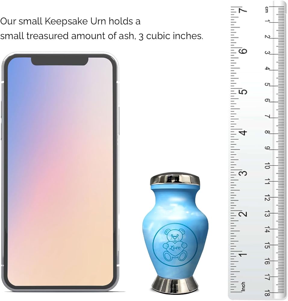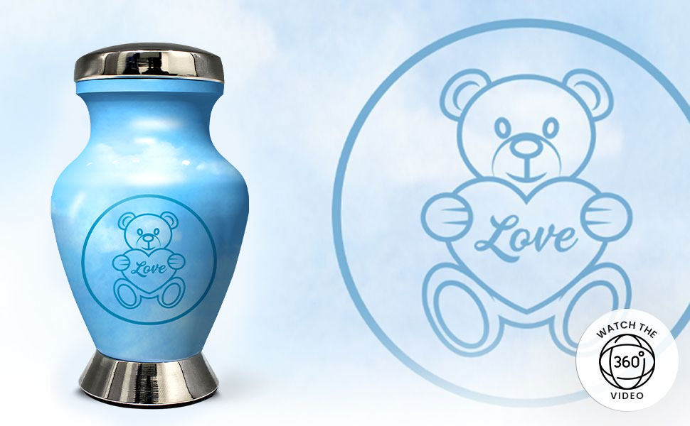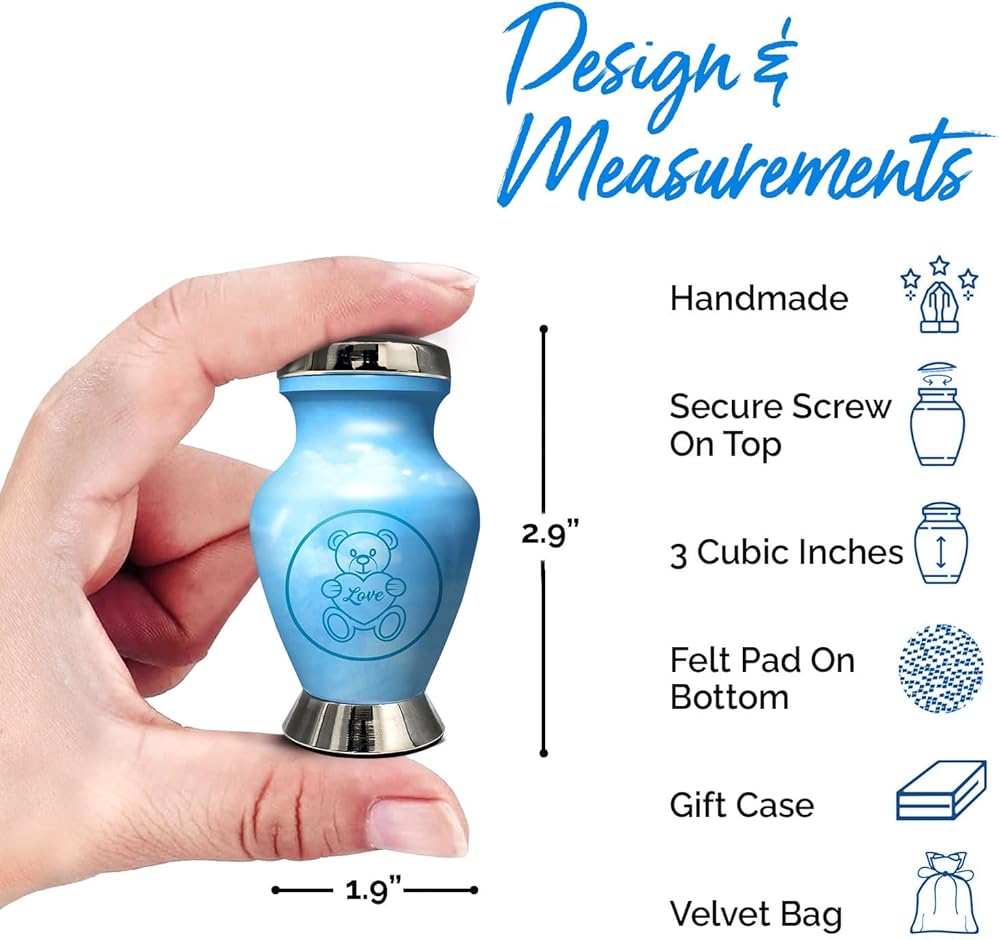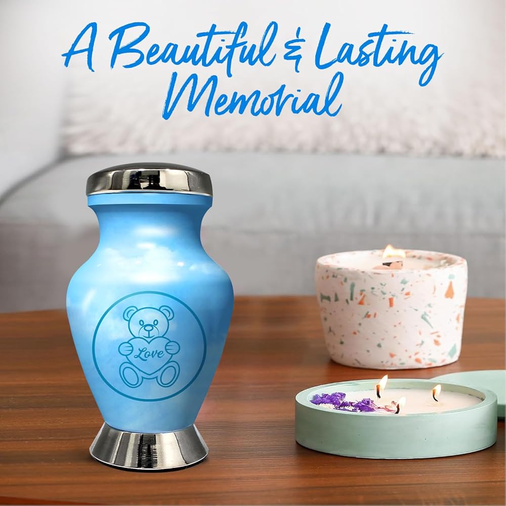 جرة صغيرة زرقاء عالية الجودة ومتينة للأطفال: هذه الجرة الجميلة للأطفال صلبة ومصنوعة من معدن عالي الجودة مع لمسة نهائية لامعة. تم تصميم جرة الرماد المعقدة يدويًا على يد حرفيين ذوي مهارات عالية باستخدام التقنيات التقليدية العريقة. كن مطمئنًا، فإن هذه الجرة الرائعة للطفلة من أجل الرماد ستكون بمثابة رمز مؤثر لذكرى أحبائك.