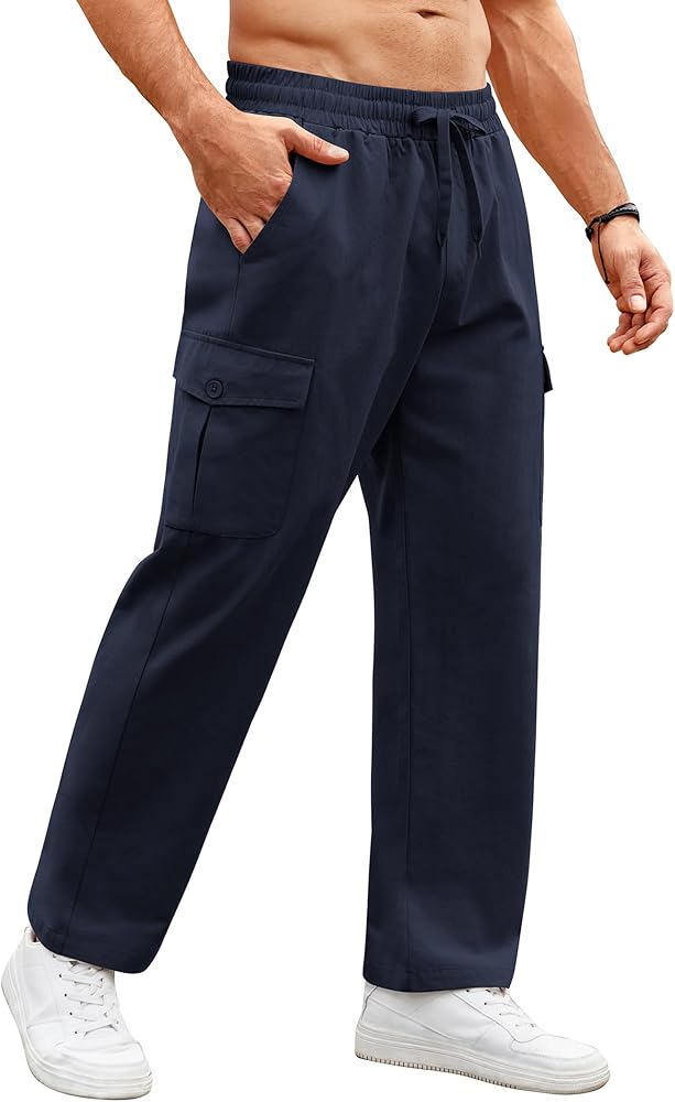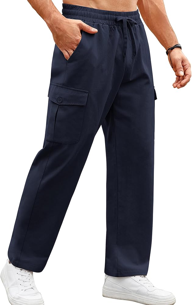 • Multi Pockets Cargo Pants - A classic cargo straight leg and drawstring elastic waistband design on the mens baggy cargo pants, 2 cargo flap pockets and 2 slash pockets offer storage for personal items.