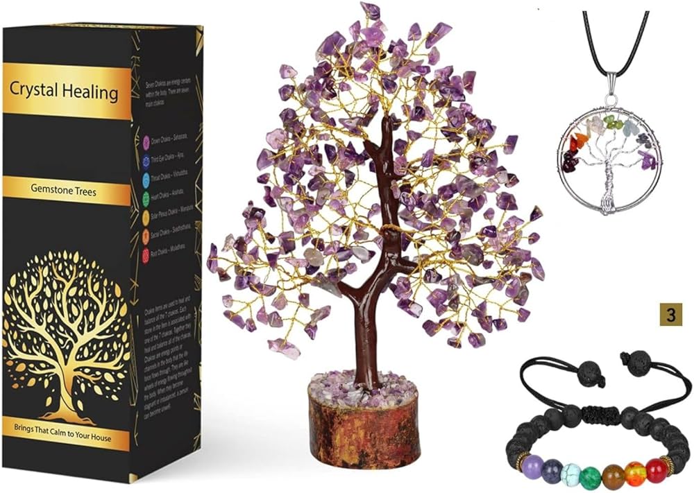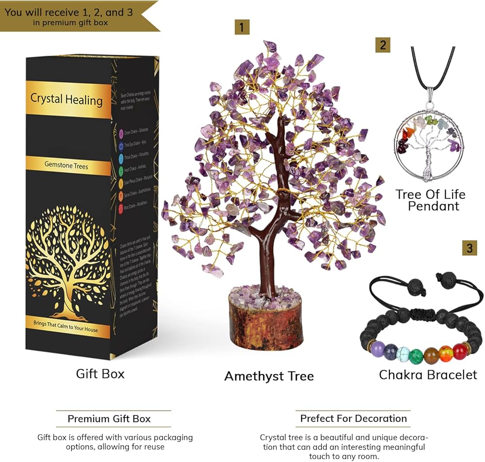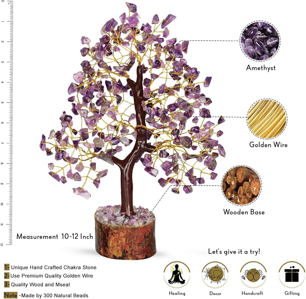 • شجرة الكوارتز - شجرة الكوارتز الكريستالية الجميلة هذه مصنوعة من البلورات والأحجار مع سلك ذهبي مغطى بختم M متصل بالقاعدة الخشبية. يبلغ حجم شجرة الكريستال 10-12 بوصة تقريبًا في الارتفاع. تأتي شجرة الكوارتز الوردية مع قلادة شجرة الحياة وسوار الشاكرا.