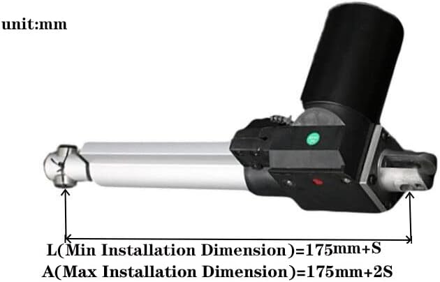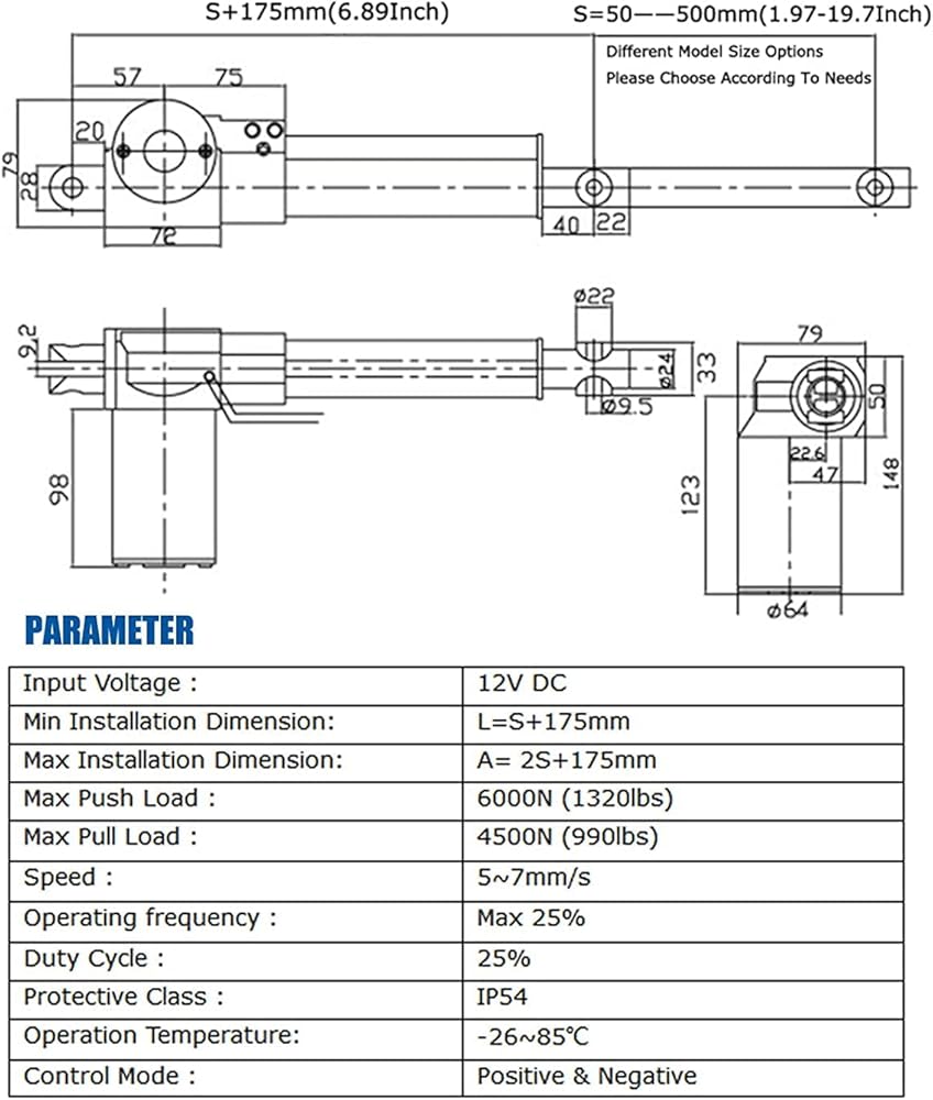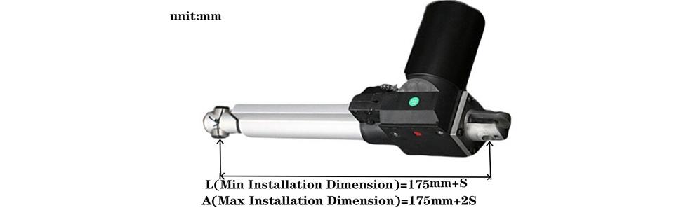 إدخال المعلمة: الجهد الكهربي: 12 فولت تيار مستمر؛ طول الشوط: S = 500 مم (19.7 بوصة)؛ الحد الأدنى لأبعاد التثبيت: L=S+175 مم؛ أقصى أبعاد التثبيت: A= 2S+175 مم؛ أقصى حمل للدفع: 6000 نيوتن (1320 رطلاً) ) ; أقصى حمولة سحب: 4500 نيوتن (990 رطلاً) ; السرعة: 5 ~ 7 مم / ثانية ; تردد التشغيل: 25٪ كحد أقصى ; دورة العمل: 25٪ ; فئة الحماية: IP54 ; درجة حرارة التشغيل: -26 ~ 85 درجة مئوية؛ وضع التحكم: إيجابي وسلبي