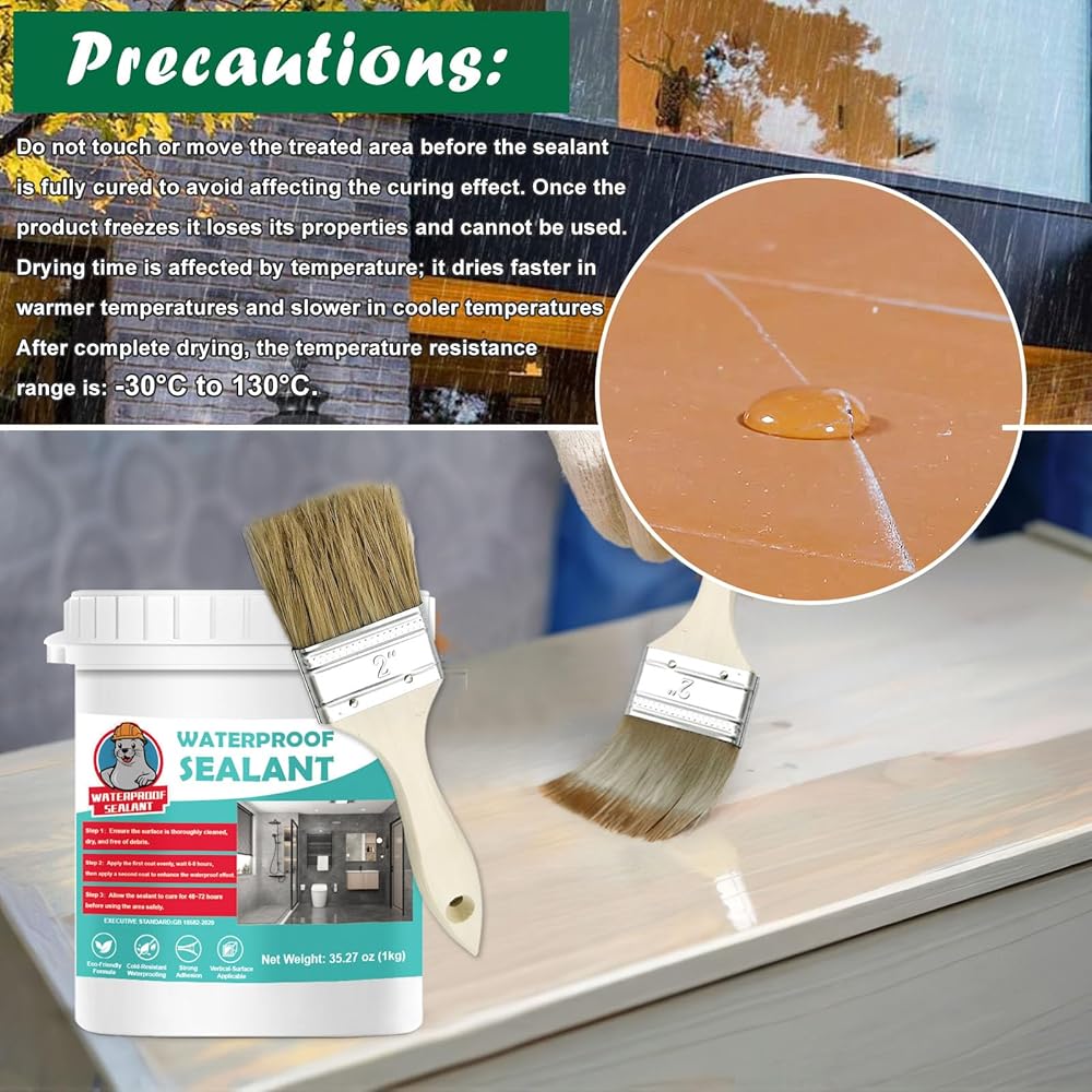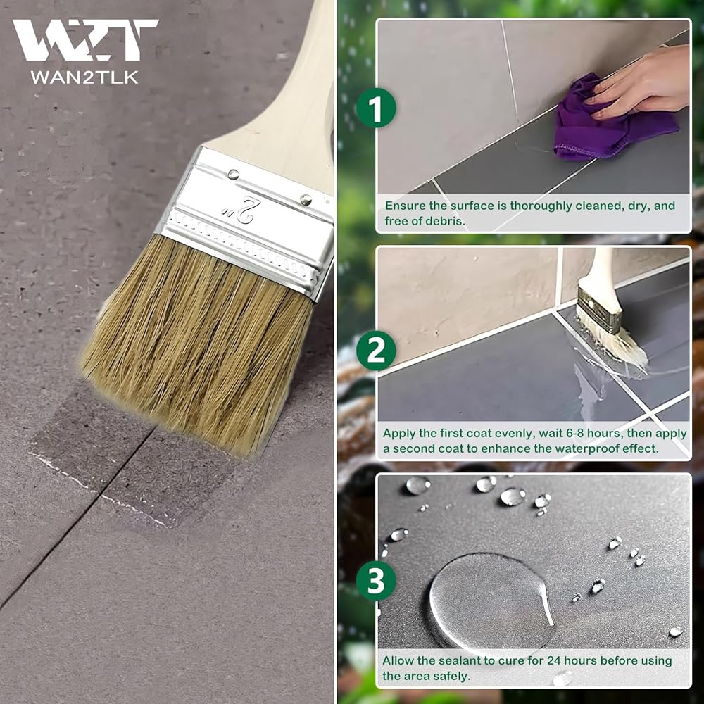 Easy to Use: Transparent waterproof glue stir properly before use. use a brush, Evenly apply the waterproof sealant on the leakage position, the self-leveling property can smoothly cover the small gaps and cracks, realize the sealing effect, stop and prevent the leakage. For good waterproofing, Apply the second coat 6-8 hours after the first coat. Wait 48-72 hours for the clear glue to dry before using it normally.