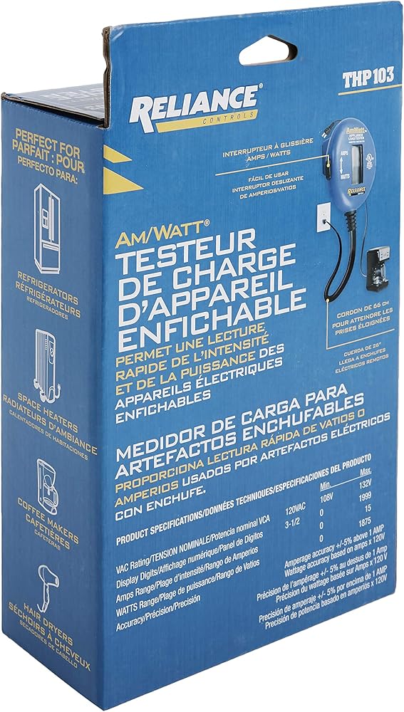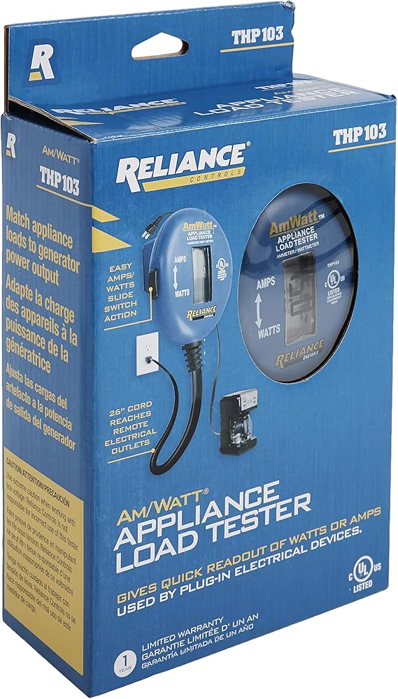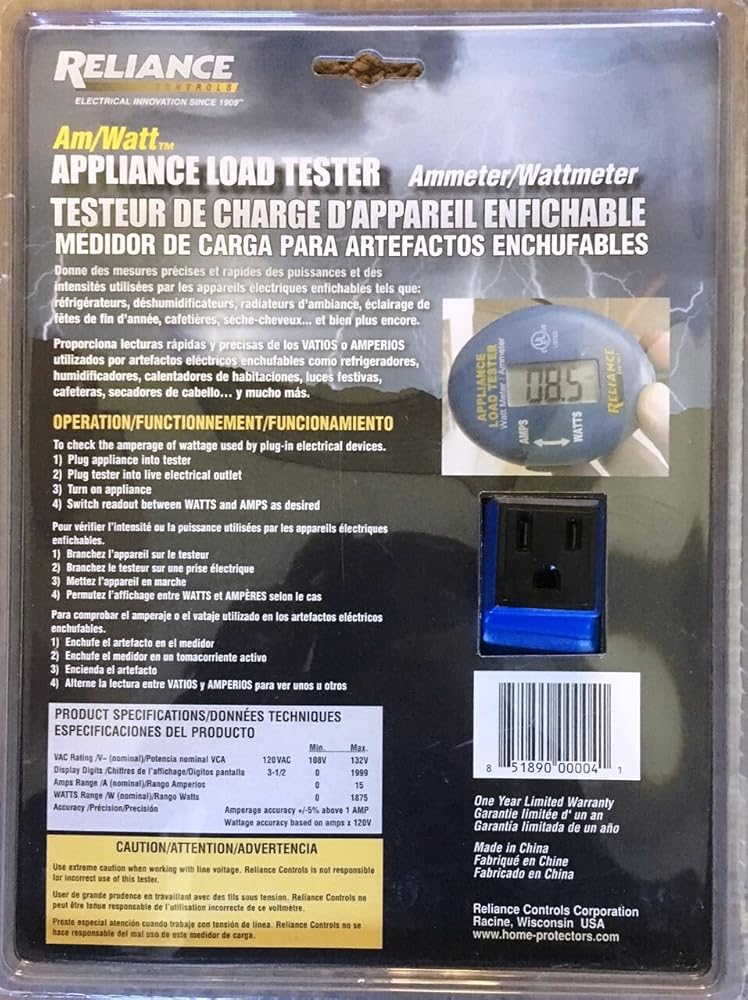 AmWatt Plug-In Digital Appliance Load tester. Only tester of its kind that gives a quick digital readout of Amps or Watts used by any plug-in appliance. Eliminates the need for expensive clamp-on meters and line splitters. Perfect for choosing the correct portable generator to purchase. Easy to use: 1. Plug appliance or light into AmWatt, 2. Plug the AmWatt into any 15A electrical outlet, 3. Turn ON the appliance or light. UL listed.