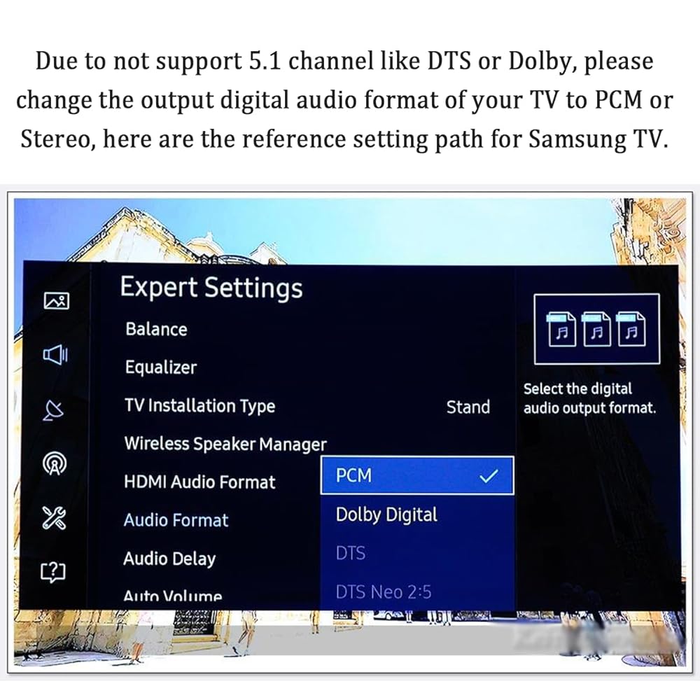 ملاحظة - لا يدعم DTS Dolby ac-3 وغيرها من الصوت الرقمي 5.1ch. يدعم هذا الكابل البصري الصوتي الرقمي إلى aux إخراج إشارة الصوت الرقمية غير المضغوطة بقناتين LPCM أو PCM. إنه يضمن نقل كهرومغناطيسي خالي من الضوضاء. يرجى ضبط تنسيق إخراج الصوت على PCM أو LPCM.