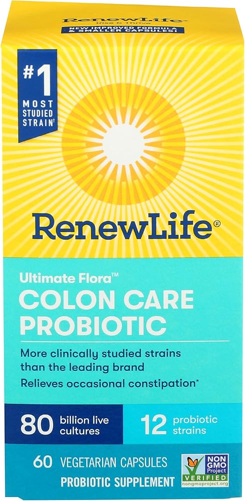 Renew Life Colon Care Probiotic has a formula that contains worldclass strains backed by science, and it has more clinically studied strains than the leading brand. Colon Care Probiotic is formulated to relieve occasional constipation and support digestive and immune health for men and women. Each smaller, easiertoswallow, oncedaily capsule has 80 billion cultures from 12 probiotic strains, including the most studied strain. Delayedrelease vegetarian capsules help the probiotics reach your gut alive. Renew Life Colon Care Probiotic is a NonGMO Project Verified probiotic supplement and is gluten free, dairy free and soy free. Potency, quality and purity guaranteed through expiration. Made in the USA of global ingredients. Our Guarantee: We stand by our products. Call 18008301800 for our 60day satisfaction guarantee. These statements have not been evaluated by the Food and Drug Administration. This product is not intended to diagnose, treat, cure, or prevent any disease; L. rhamnosus GG strain, PubMed Clinical Trials, September 2021; Terms and conditions may apply, call 18008301800.
