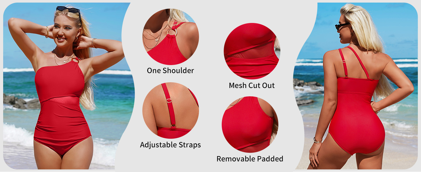 • نمط كتف واحد: يتميز ثوب السباحة التنحيف هذا بخط عنق بكتف واحد قابل للتعديل ومزود بأشرطة على شكل حرف O لطيفة