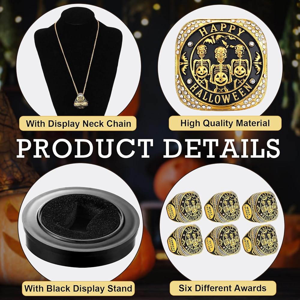 • 6 Elegant Design: the design of our Skeleton rings brings together elements of trophies, diamonds, and black gold, printed with "HAPPY HALLOWEEN""BEST COSTUME""FUNNIEST COSTUME""SCARIEST COSTUME"and so on, 6 awards total; This brilliant fusion creates a stunning visual appeal that makes each ring a piece of art in its own right; The skillfully incorporated elements make for a ring that is as remarkable as the victory it stands