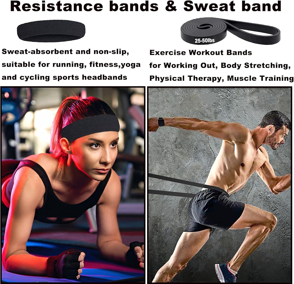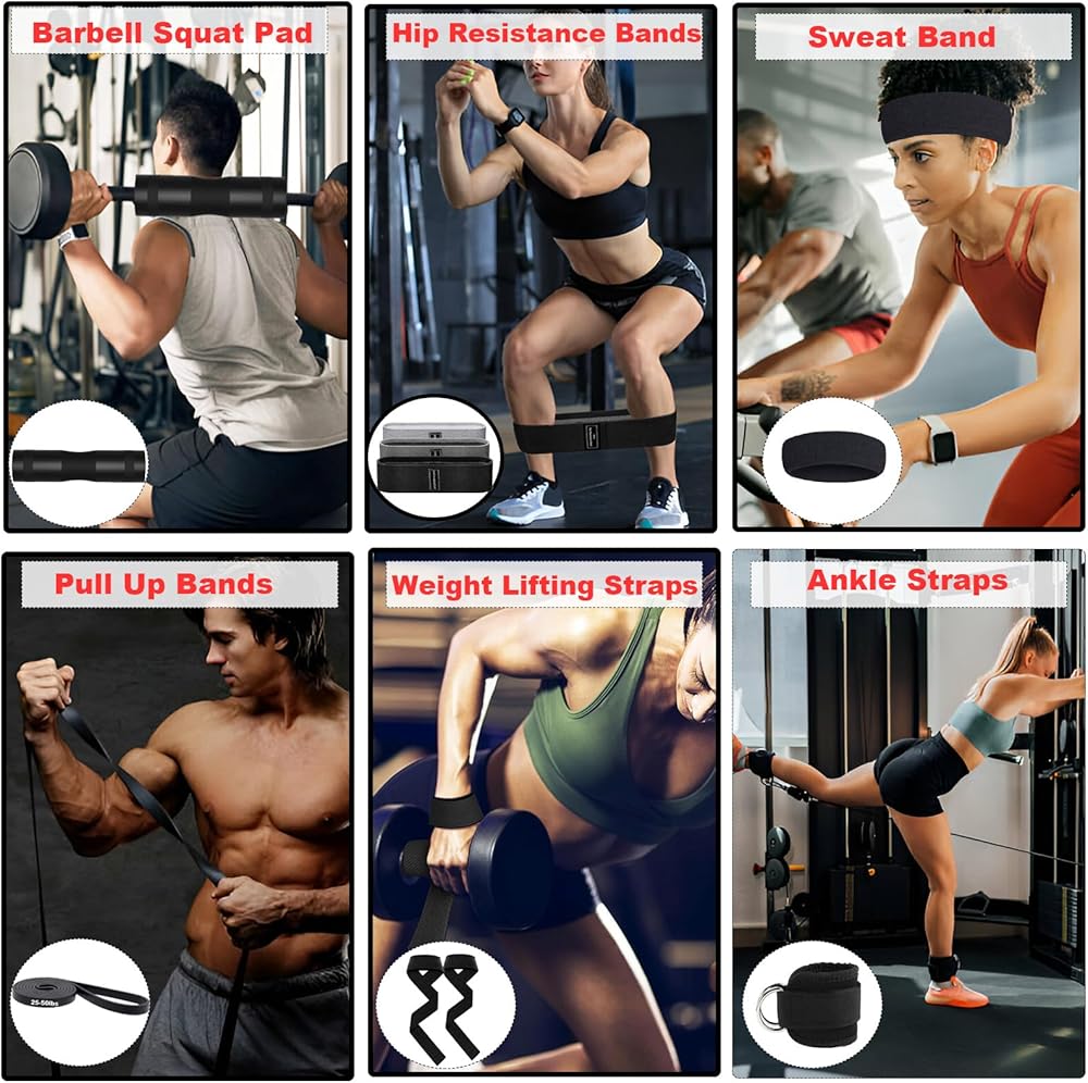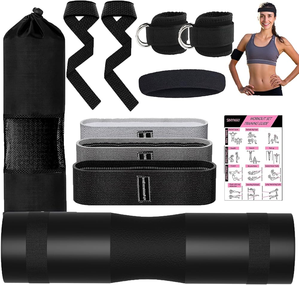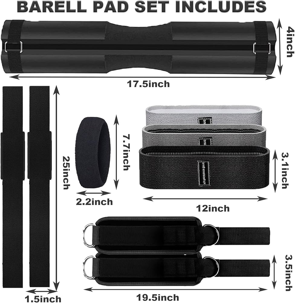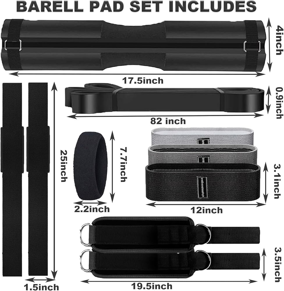 مجموعة وسادات الأثقال، 11 قطعة من ملحقات الصالة الرياضية، وسادة القرفصاء من أجل دفعات الورك وطعنات الساق مع شريطين للكاحل في صالة الألعاب الرياضية، و3 أشرطة مقاومة، وحزامين للرفع، وأربطة سحب، وعصابات رأس، ووسادة رفع الأثقال وحقيبة حمل
