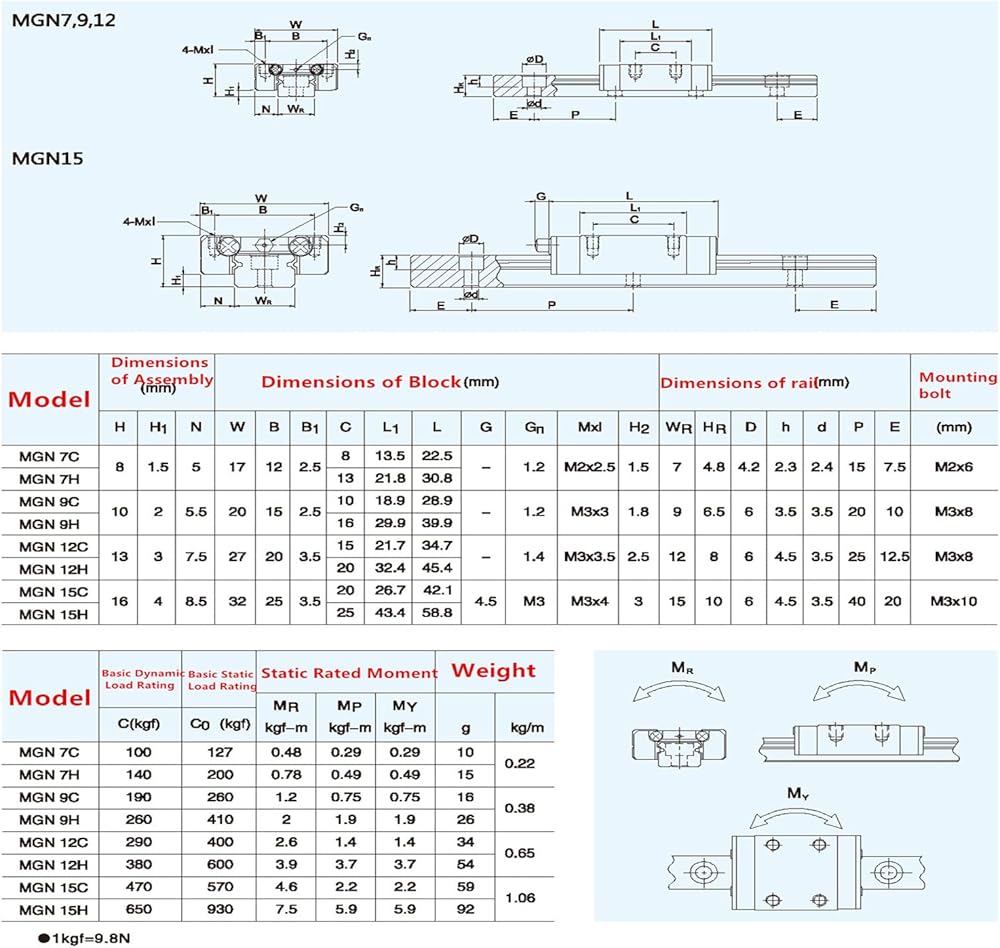 MGN12H Linear Rail Kits: This linear rail guide set includes 1 piece 9.84 in / 250 mm MGN12 linear rail guide and 1 piece MGN12H sliding block. Sliding block is used cooperatively with rails, smooth sliding provided by the inside linear bearing.