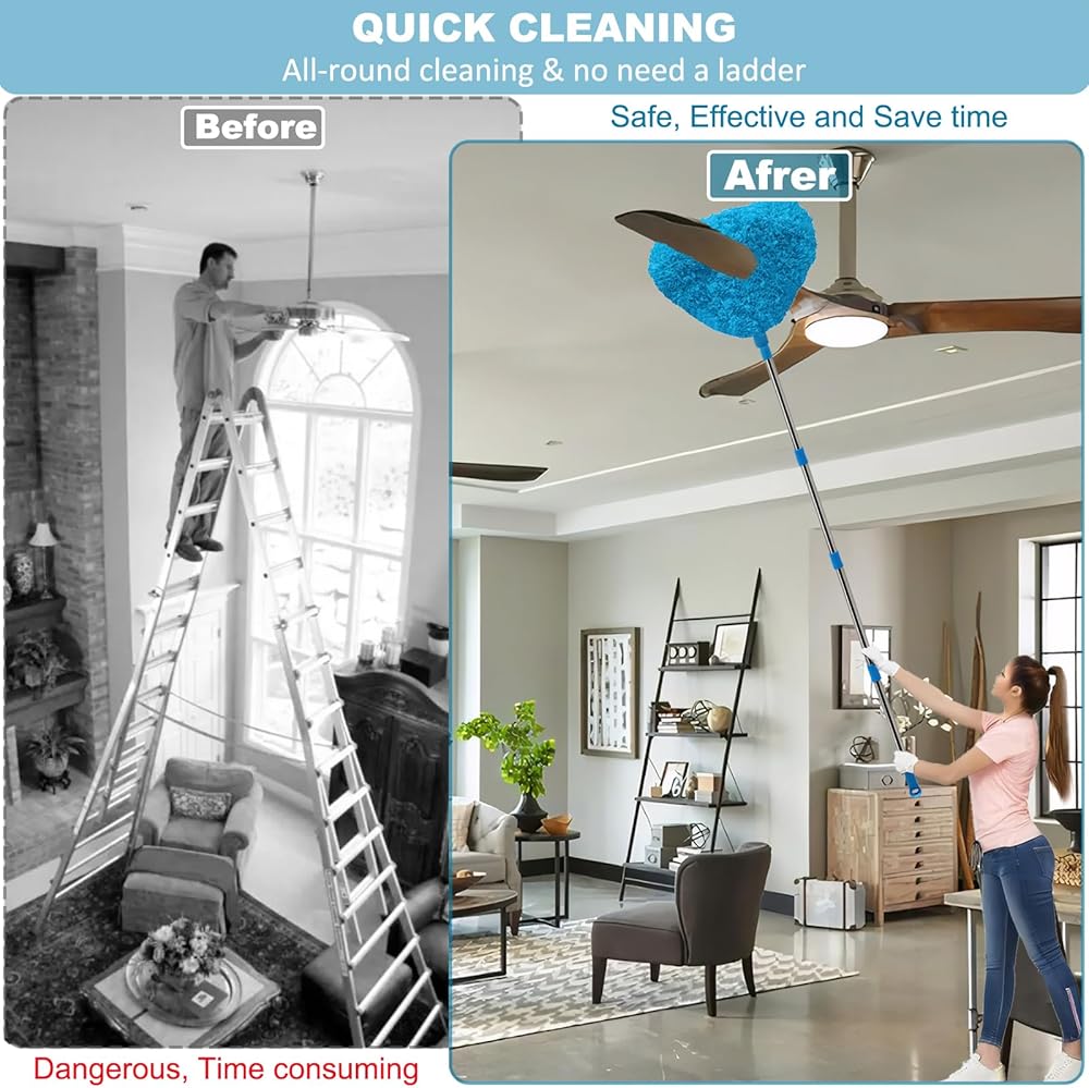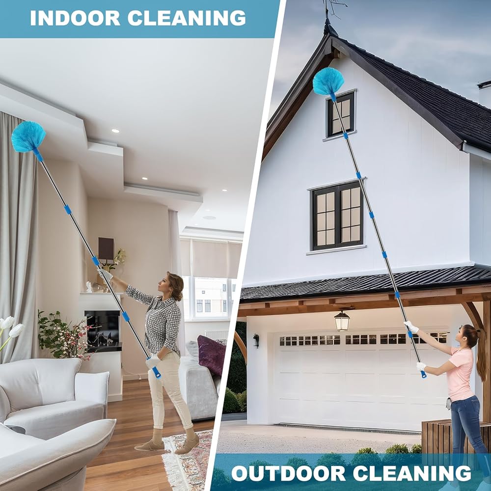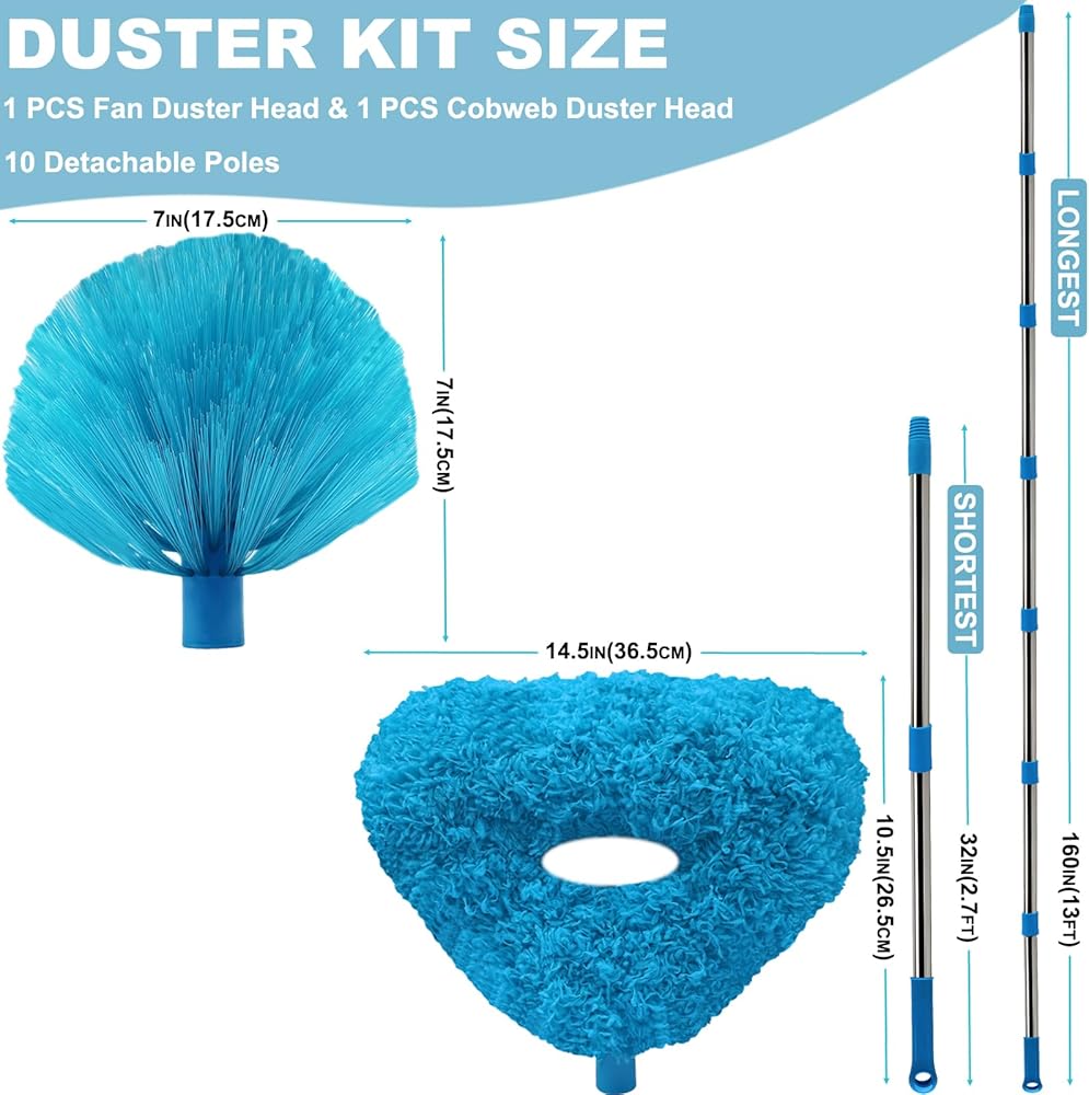 طقم غبار يصل طوله إلى 20+ قدم، منفضة غبار من نسيج العنكبوت ومروحة سقف مع عمود قابل للربط بطول 3-14 قدم للتنظيف، منفضة ريش من الألياف الدقيقة لتنظيف جدران المروحة وأرفف الكتب ونافذة باب الأثاث