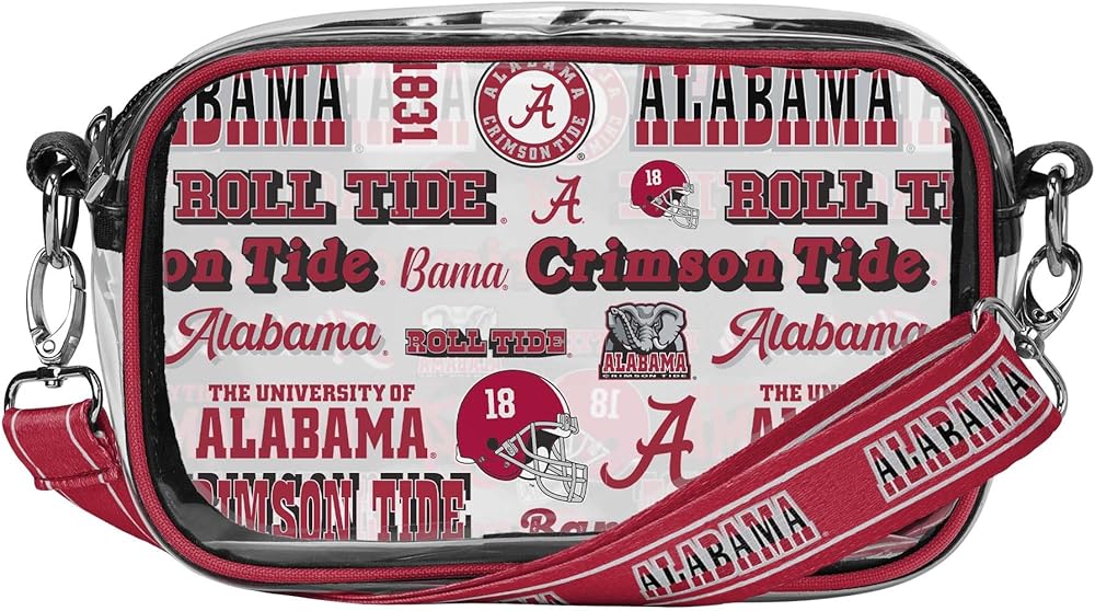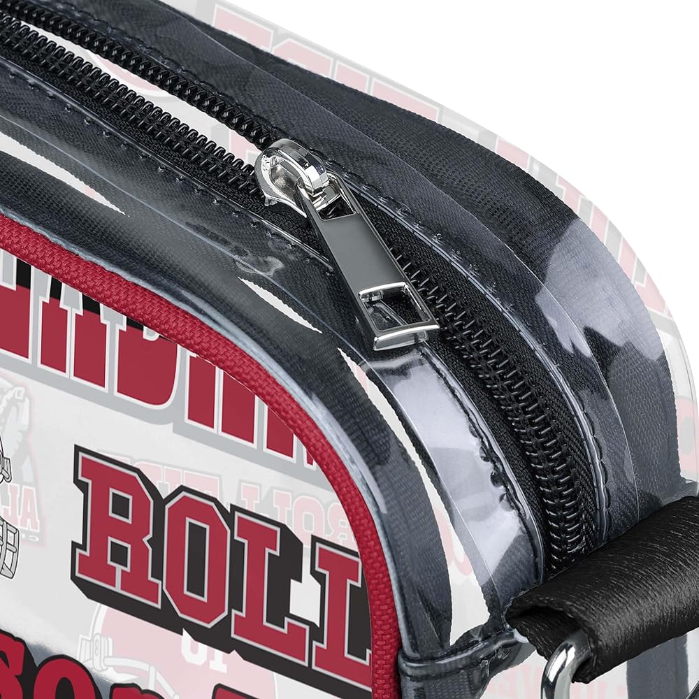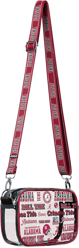 Stadium Approved Size Clear Bag: Measures approximately 8.1in. x 2.6 in. x 4.9 in. with volume capacity of 2L. Strap length approximately 44 in. Durable, clear, see-through material making this the perfect choice for tailgates, gamedays, concerts, shows, shopping, weddings, graduations, and more
