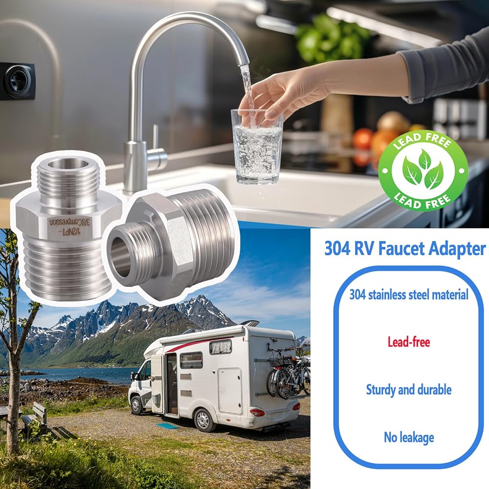 مادة فاخرة: محول صنبور RV مصنوع من الفولاذ المقاوم للصدأ 304. لا حاجة إلى معالجة طلاء النيكل، وهو أقوى وأكثر متانة ومقاوم للتآكل والصدأ من مادة النحاس.