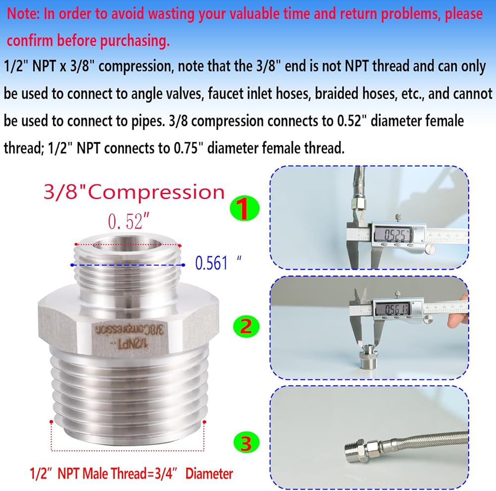 الحجم القياسي: ضغط 1/2 بوصة NPT × 3/8 بوصة، لاحظ أن الطرف 3/8 بوصة ليس خيط NPT ويمكن استخدامه فقط للتوصيل بصمامات الزاوية وخراطيم مدخل الصنبور والخراطيم المضفرة وما إلى ذلك، ولا يمكن استخدامه يمكن استخدامها للتوصيل بالأنابيب. ضغط 3/8 يتصل بخيط أنثوي بقطر 0.52 بوصة؛ 1/2 بوصة NPT يتصل بخيط أنثوي بقطر 0.75 بوصة، يرجى التأكد قبل الشراء.