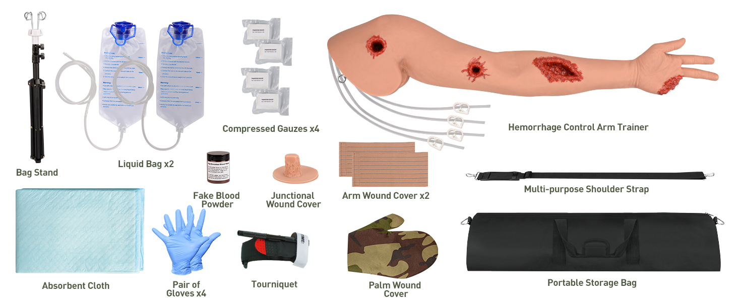 【محاكاة واقعية】: يوفر مدرب ذراع تعبئة الجروح محاكاة واقعية لأربعة إصابات في الأطراف العلوية، بما في ذلك التمزقات العميقة وجروح الطلقات النارية وجروح مفاصل الكتف والأصابع المقطوعة. التحكم المستقل في النزيف يخلق سيناريوهات تدريب واقعية لتعزيز التطبيق العملي.