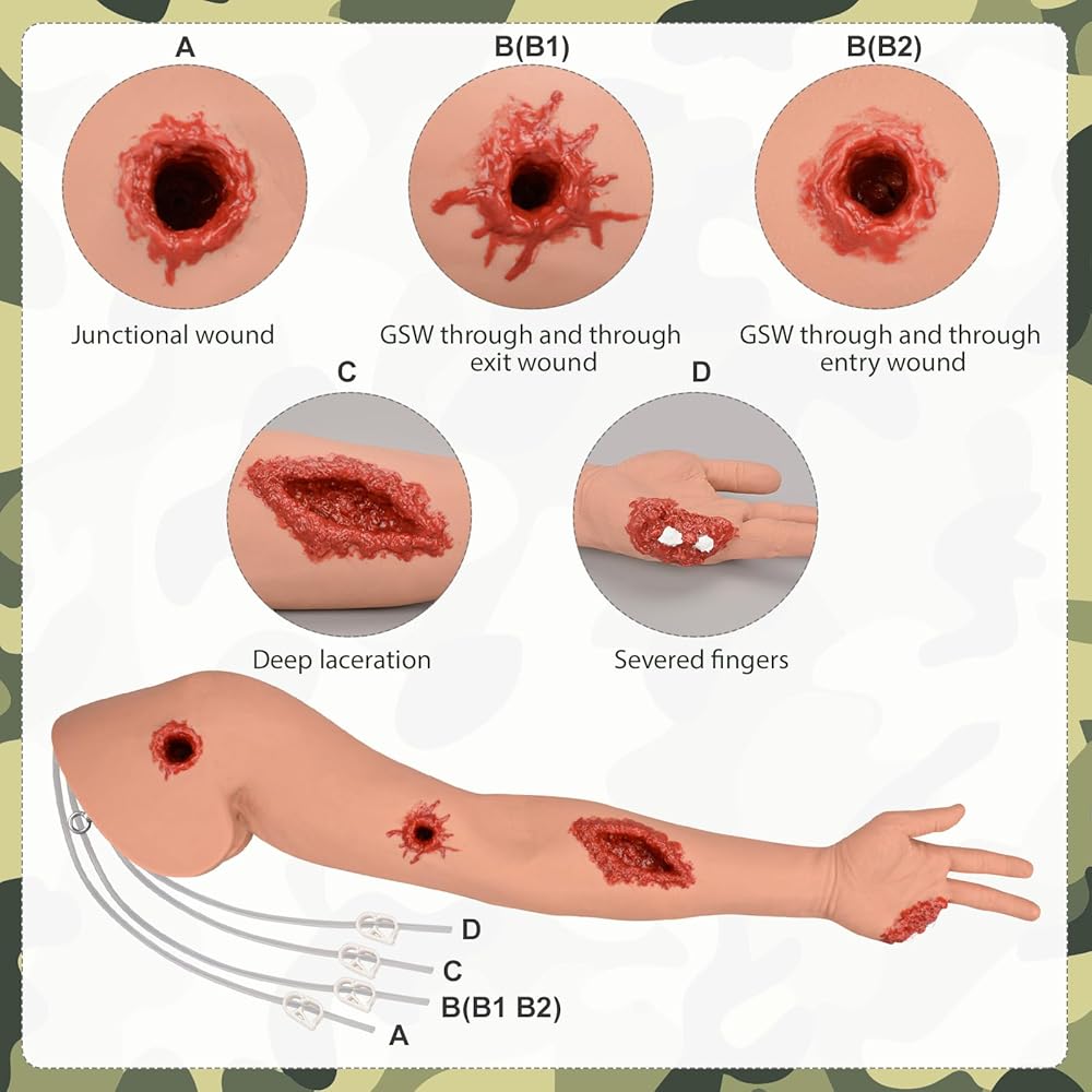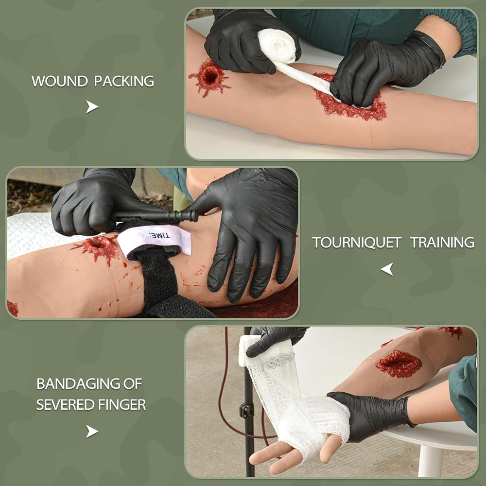 【تدريب شامل】: يغطي سيناريوهات مختلفة مثل جروح الوصلات والأصابع المقطوعة، ويقدم جهاز محاكاة ذراع تعبئة الجروح تدريبًا شاملاً على تطبيق العاصبة وتغليف الجروح. مناسب للتدريب على TCCC والرعاية المدنية، فهو يضمن الاستجابة الفعالة لحالات الطوارئ.
