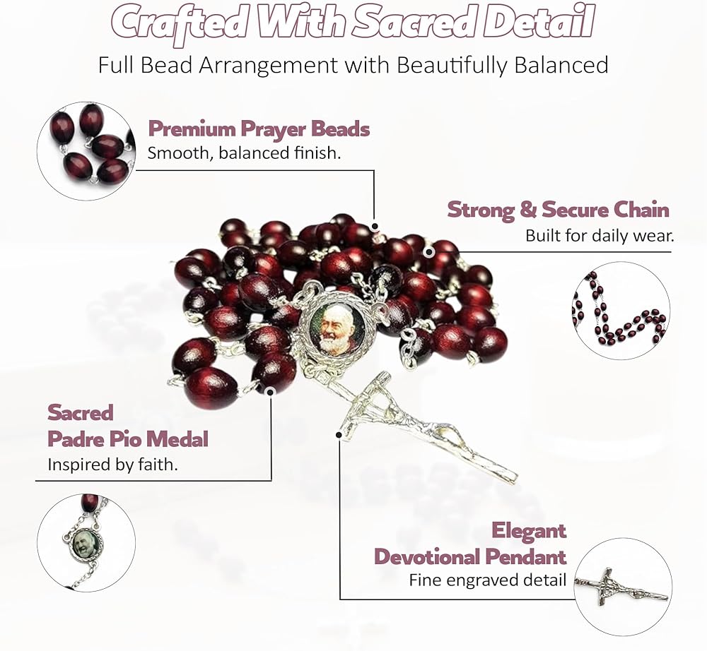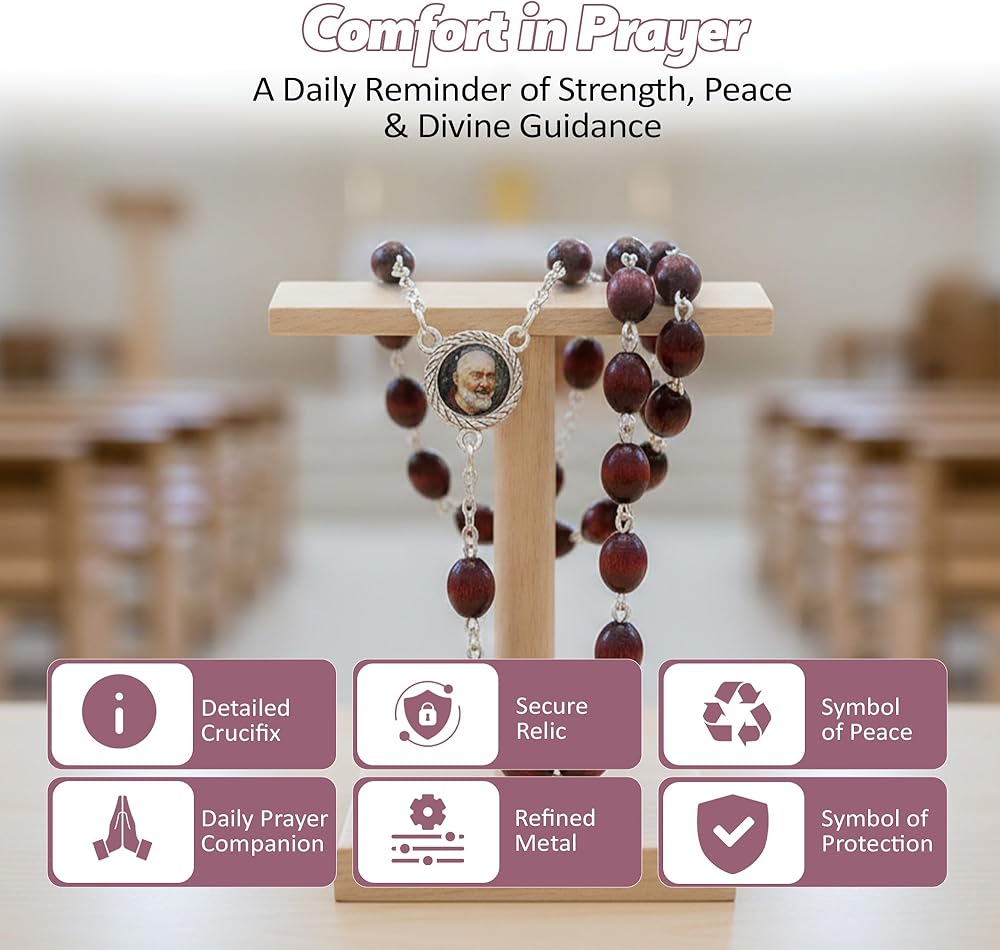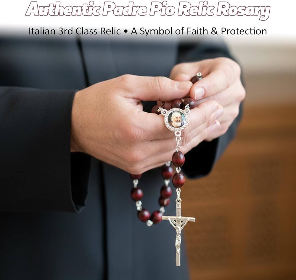 3rd class Relic Rosary of Saint Padre Pio rosary length* 22inch *(from the end of the cross to the middle of 3rd decade) cross size 1.75" x 0.75" bead size 0.375" x 0.25" Saint Pio of Pietrelcina (Italian: Pio da Pietrelcina), O.F.M. Cap. commonly known as Padre Pio, (May 25, 1887 – September 23, 1968) was a friar, priest, stigmatist, and mystic of the Roman Catholic Order of Friars Minor Capuchin. Saint Padre Pio became famous for bearing the stigmata for most of his life, which generated much interest and controversy around him. He is now venerated as a saint in the Catholic Church. Saint Pio was born Francesco Forgione, and given the name of Pius (Italian: Pio) when he joined the Capuchins. After his beatification in 1999, he was canonized by Saint John Paul II on June 16, 2002 What is Ex indumentis? The phrase Ex indumentis is Latin for "from the clothing", most commonly used when referring to 2nd Class holy relics of saints or blessed individuals In proper ecclesiastical phraseology, ex indumentis is used when referring to an article or fragment of clothing that was owned or used by a saint (or similarly blessed individual). However, In recent years, contemporary manufacturers of relic medals, holy plaques, saint statues and religious trinkets label their items as being ex indumentis even though they are not such; rather, they are items touched to an actual relic of the saint, then stamped out en-masse to be attached to their souvenir medals or statues,etc. As such, they are 3rd-class relics and not 2nd-class relics, as the phrase ex indumentis implies. All our items are marketed as 3rd class relics. They are items touched to the actual relic of the saint.