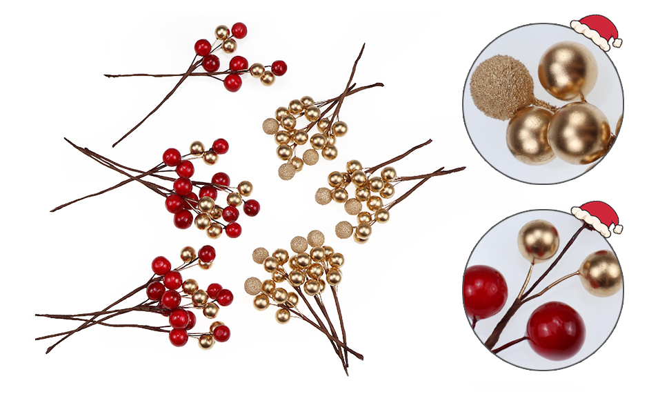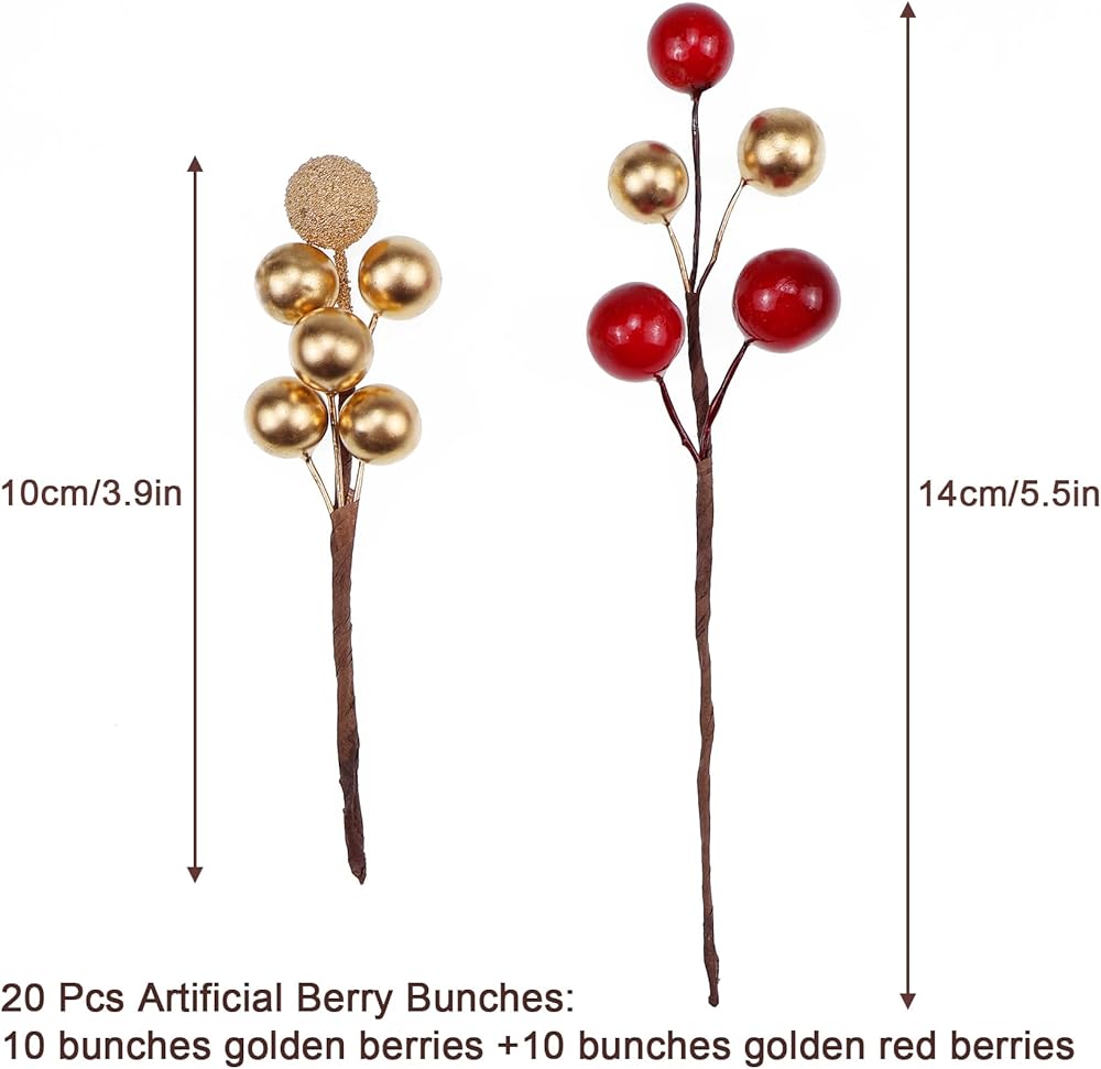 التعبئة والتغليف المثالي: 20 قطعة من التوت الاصطناعي تتكون من 10 مجموعات من التوت الذهبي و10 مجموعات من التوت الذهبي والأحمر، كل مجموعة تحتوي على 5 حبات صغيرة. مجموعة مختلطة تناسب معظم احتياجات تزيين المنزل
