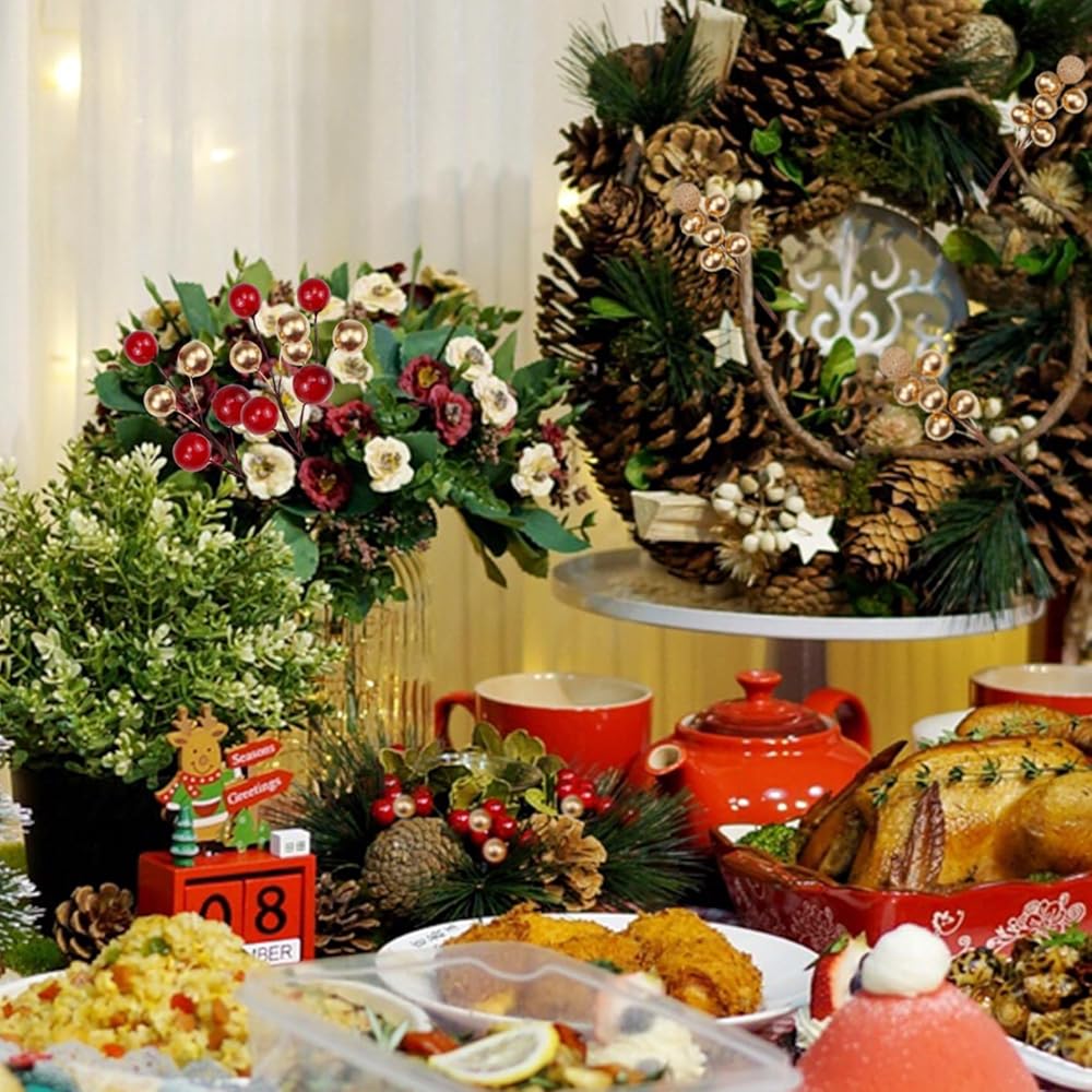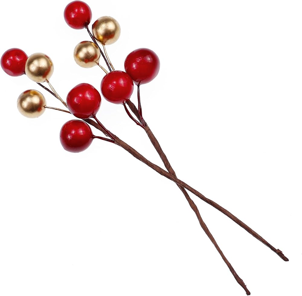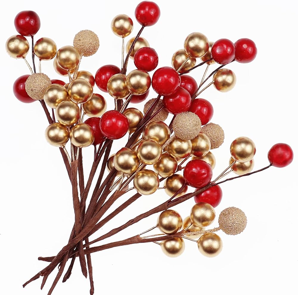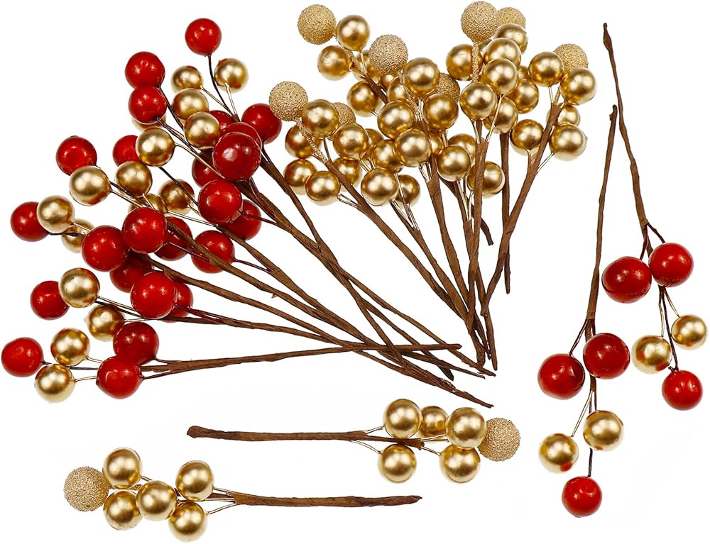 زينة التوت الاصطناعي: تبدو مجموعات التوت الاصطناعي الذهبية والحمراء نابضة بالحياة. يبلغ قطر التوت الصغير حوالي 0.4 بوصة ويبلغ طول كل خصلة حوالي 3.9 بوصة، وهي مصنوعة من مادة إسفنجية وأسلاك. مثالية لتزيين عيد الميلاد