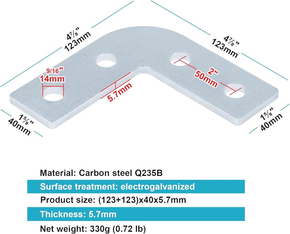 6 عبوات من 4 فتحات بزاوية 90 درجة، تركيب قناة تبختر 1-5/8 بوصة، موصل على شكل حرف L، لوحة مسطحة لنجار الزاوية، قبول مسمار 1/2 بوصة، فولاذ مجلفن كهربائيًا، سمك 5.7 مم