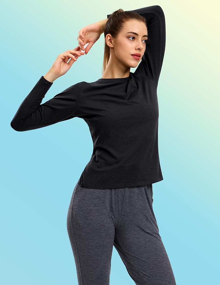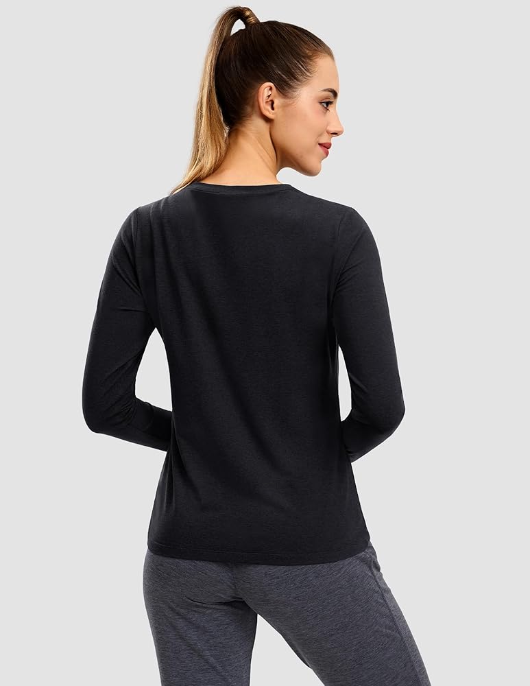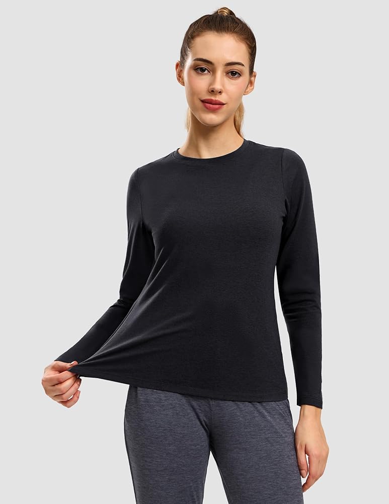 قمصان أساسية بأكمام طويلة: يوفر هذا القماش مرونة عالية، مما يضمن ملاءمة شخصية مريحة وقابلة للتمدد. القميص النسائي طويل الأكمام مثالي للارتداء مع طبقات أو ارتداؤه بمفرده