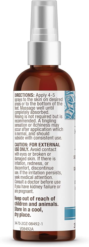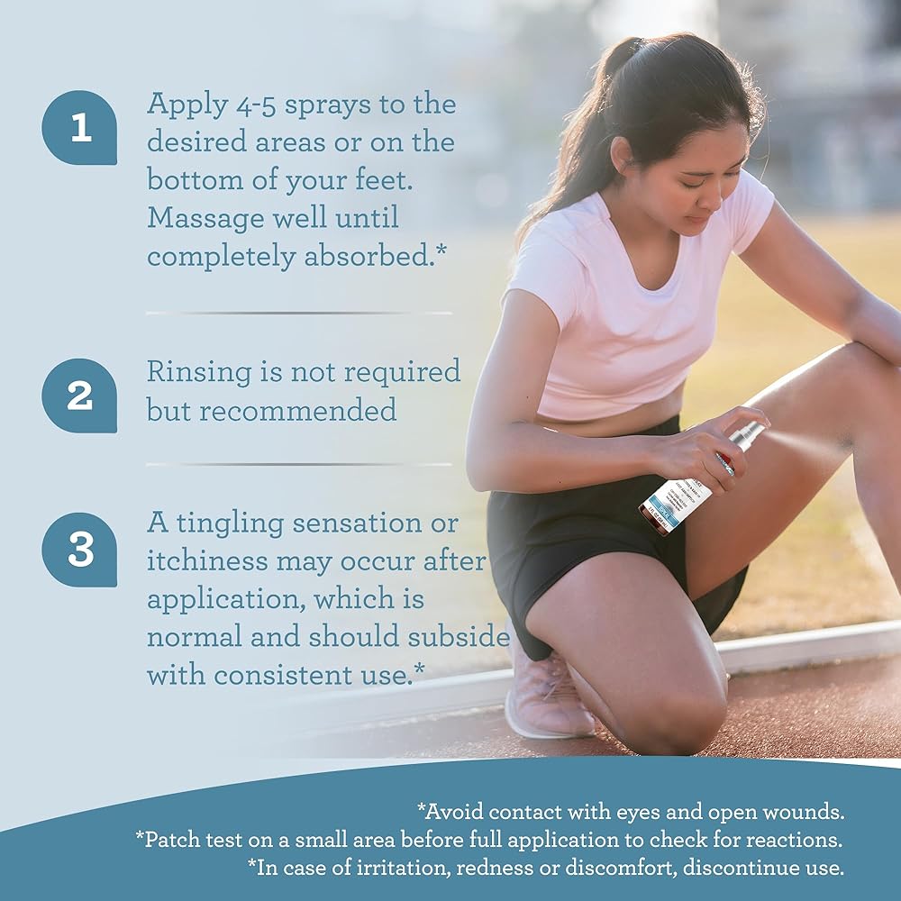 How to use: Apply 4-5 sprays of our magnesium spray for pain on the sore areas or the soles & massage well. Initially, a tingling sensation may occur, which subsides on continued use of the spray