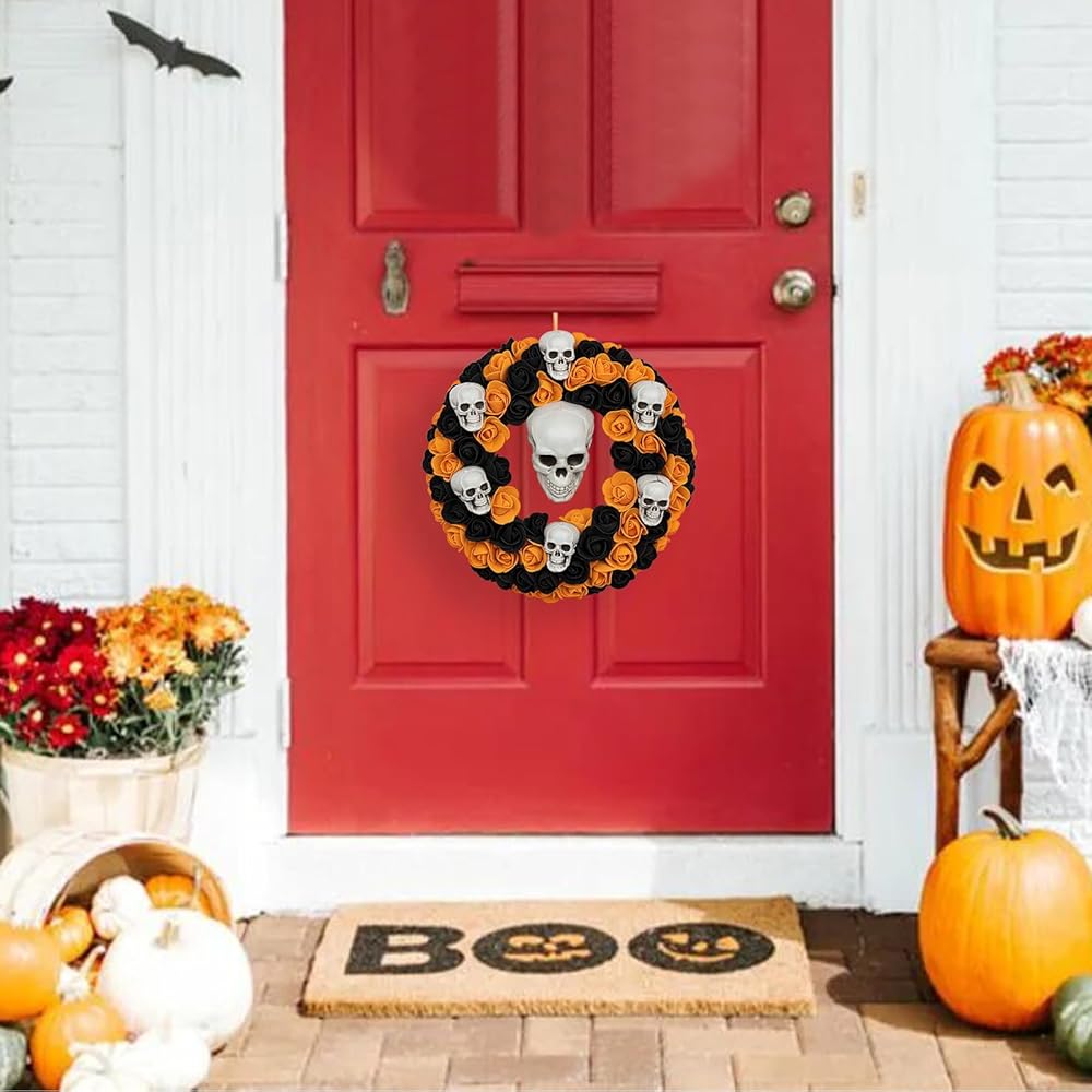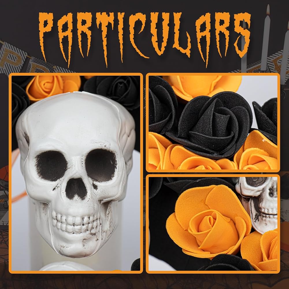 【Artificial Halloween Wreath】This Halloween wreath is handmade of black and orange roses and 7 skulls.It is very suitable for creating a terrifying atmosphere for Halloween.