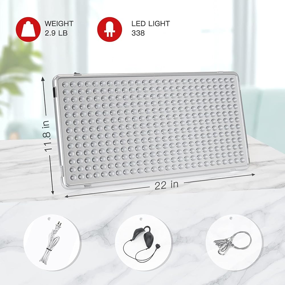 مواصفات لوحة العلاج بالضوء LED: قياس لوحة الضوء الأحمر: 22*11.8*0.7 بوصة، إجمالي وزن المنتج 8.64 رطل، استهلاك الطاقة 60 وات، الوزن 3.3 رطل. يمكنك تعليقه على باب لوحة العلاج الأحمر أو تعليقه على الخطاف، مع ترك إشعاع الجسم بالكامل للاستخدام.
