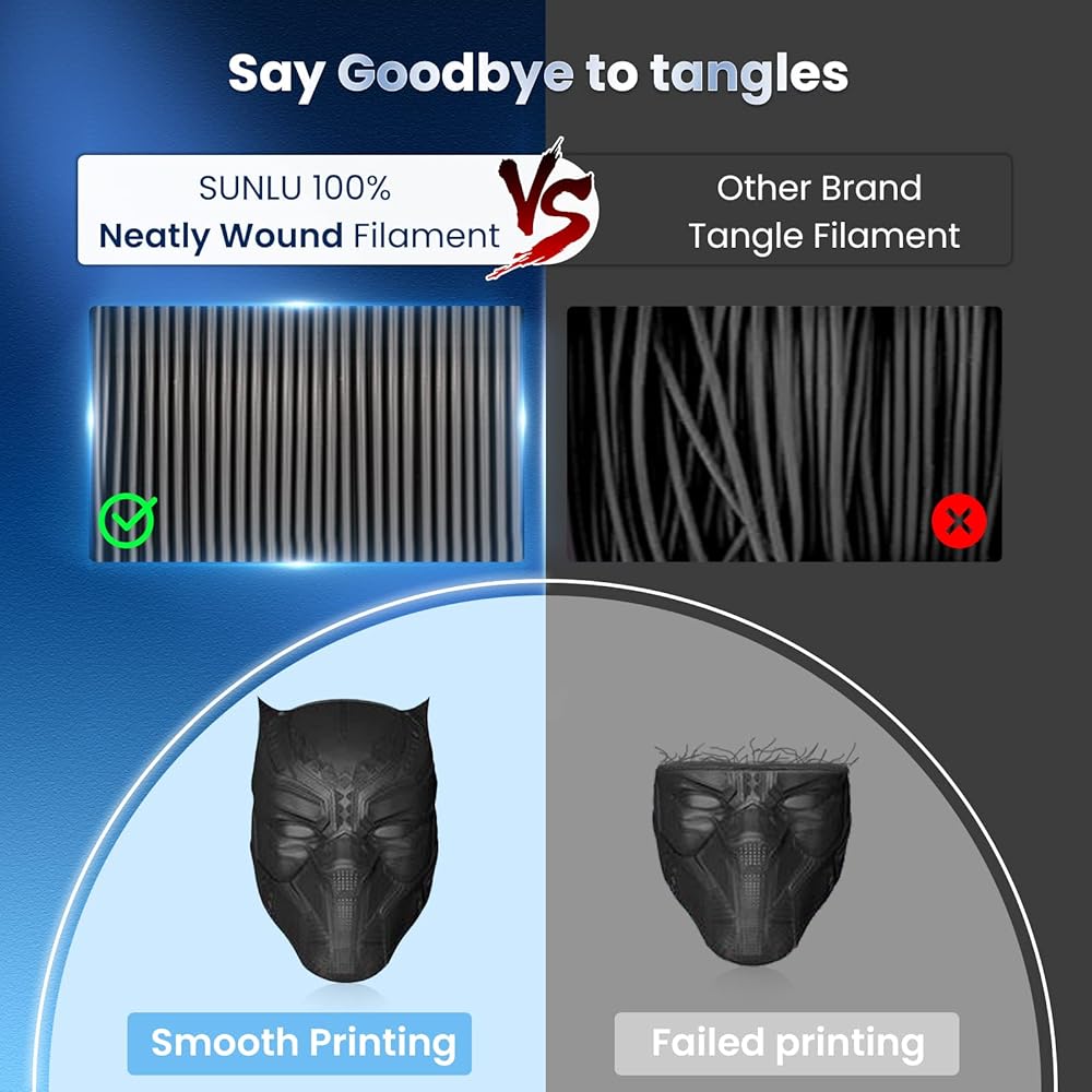 【خيوط SUNLU للجروح بدقة】- أتقن فريق SUNLU R&D التكنولوجيا المتقدمة وأنتج 100% خيوط PLA+، وهو أمر مستحيل بالنسبة للعلامات التجارية الأخرى. لا عقدة، لا لف، وتحسين كفاءة الطباعة.