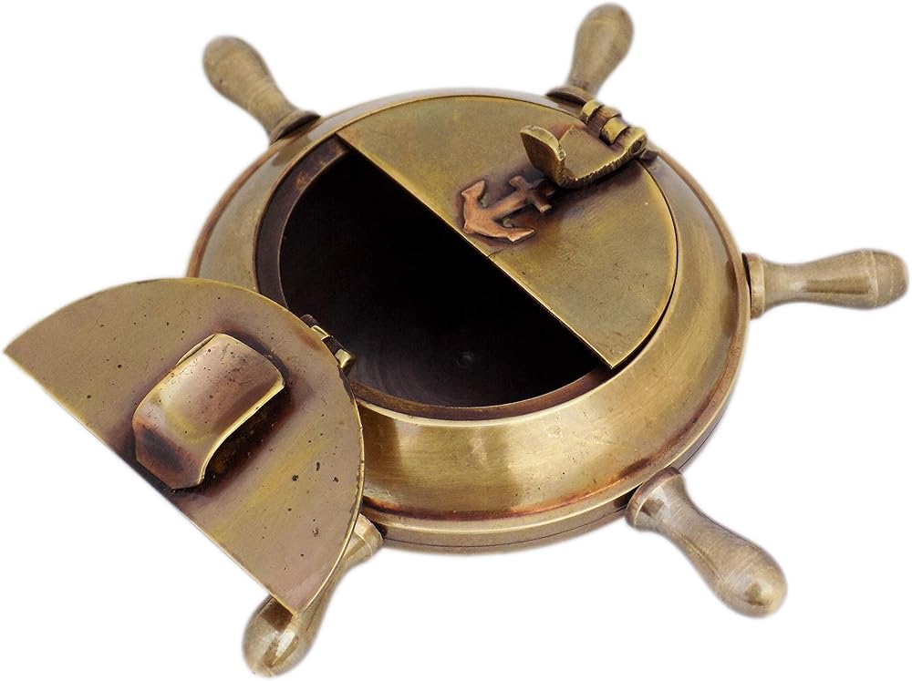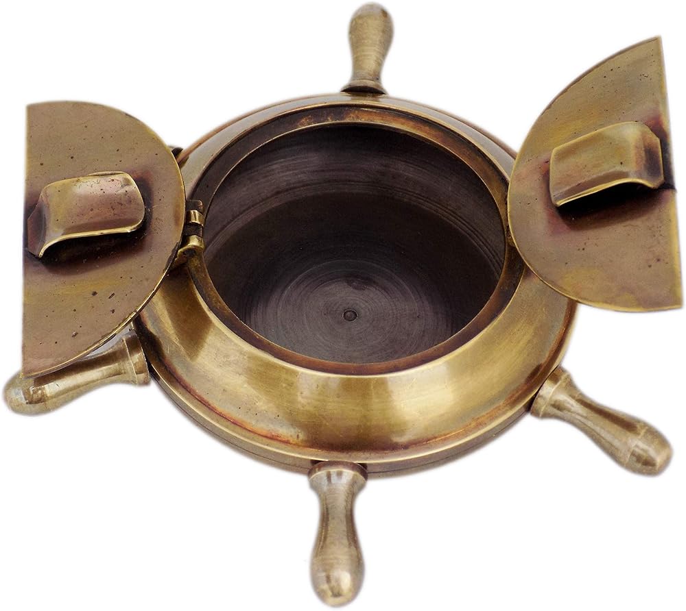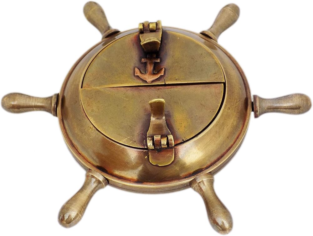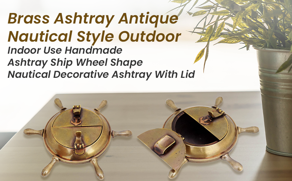 JD'Z COLLECTION منفضة سجائر نحاسية طراز بحري عتيق للاستخدام الداخلي والخارجي منفضة سجائر مصنوعة يدويًا على شكل عجلة سفينة منفضة سجائر مزخرفة بحرية مع غطاء