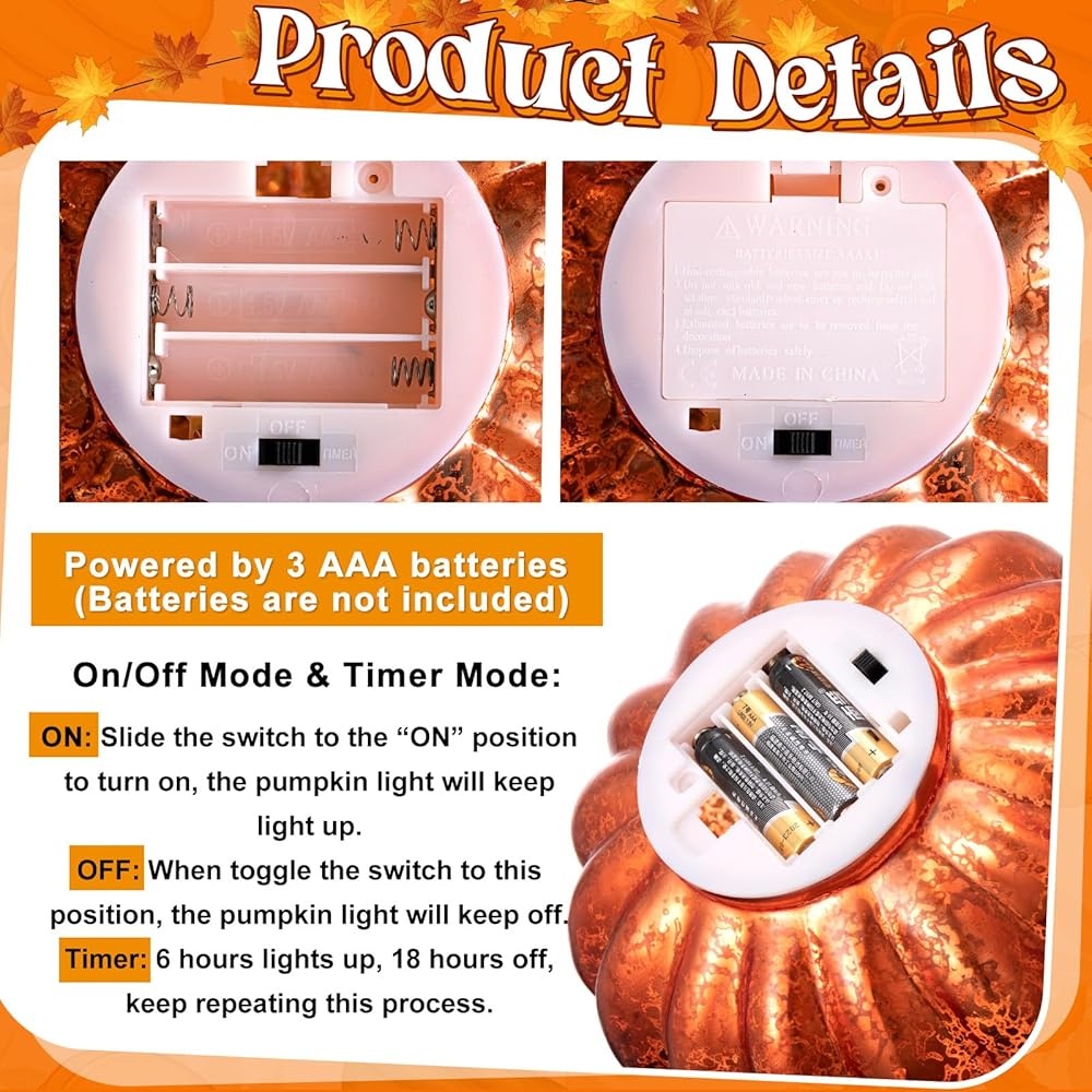 Timer Mode: featuring an on/off and a 6 hour timer mode, when the 6 hour timer is finished, it will start after 18 hours; These lighted pumpkins cater to your needs effortlessly; You'll not be bothered with turning these lights on and off every night; Convenient and energy saving decorative lighting, please note that include battery is not included