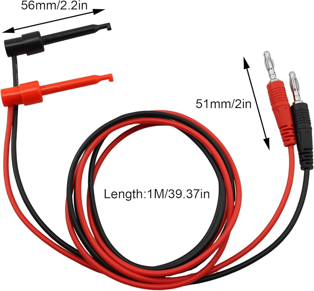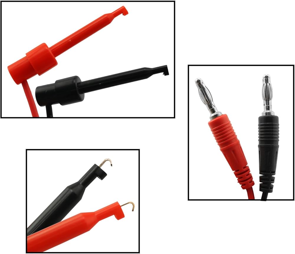 This standard 4mm banana plug is perfectly compatible with most multimeters and devices. It is made using pure copper injection molding technology, ensuring excellent conductivity and durability. The attached test hook is made of high-quality copper and equipped with a spring-loaded hook end, allowing for a secure grip and accurate measurement. It is suitable for use in laboratories, schools, automotive, household, and industrial environments. Each set includes two 3.3-foot long test leads, capable of withstanding up to 500V and 5A, ensuring safe and reliable testing. We offer a 30-day return/exchange guarantee and a 1-year warranty, providing confidence in your choice.