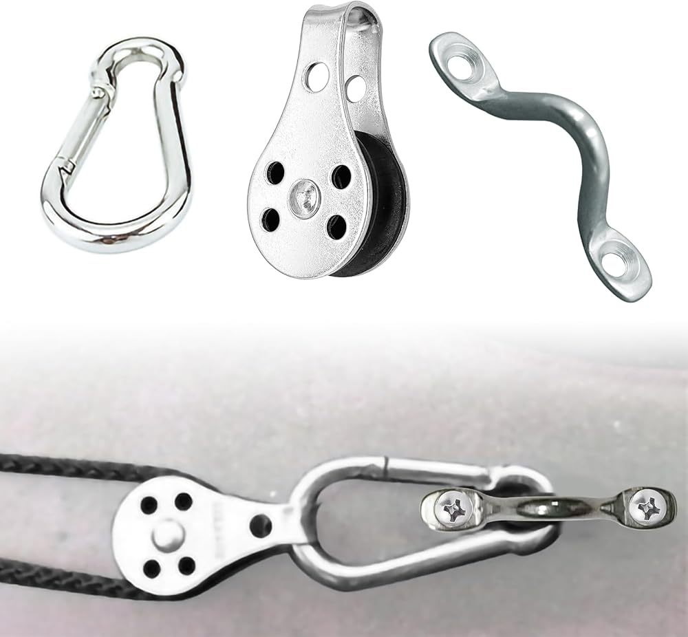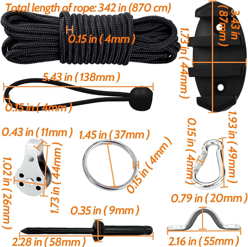 1 X 9m rope, 2 X elastic buckles, 2 X pulleys, 1 X rope cleat, 2 X spring snap hook, 1 X stainless steel ring, 4 X pad eye, 10 X screws, 10 X nuts, 10 X rivets